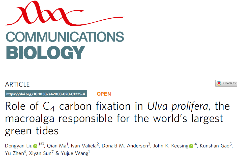 针对黄海浒苔每年大规模爆发生理学机制不明等问题,研究团队通过野外调查和室内培养多相结合的方法展开了深入研究。结果发现,与大多数海洋藻类不同,黄海浒苔的光合固碳途径除了经典的C3循环途径,还存在CO2浓缩机制与C4循环途径,将碳酸氢根离子转换为细胞内CO2,大大增加了浒苔的光合固碳能力。通过测定 CO2浓缩机制与C4循环途径关键酶的活性,以及酶与产物的响应关系,发现当营养物质供给充足时,C4活动主要发生在高光条件下,而CO2浓缩机制主要发生在低CO2条件下。研究结果揭示了浒苔漂浮过程中,受高光辐射依然能够快速生长的生理学机制,并提出浒苔的多面光合作用模式是其在短时间内形成大规模生物量的重要生物学基础。相关成果于9月7日以“Role of C4 carbon fixation in Ulva prolifera, the macroalga responsible for the world’s largest green tides”为题在线发表于国际著名学术期刊《Nature》子刊《Communications Biology》上,刘东艳研究员为论文第一作者和通讯作者。(阅读原文:https://doi.org/10.1038/s42003-020-01225-4)