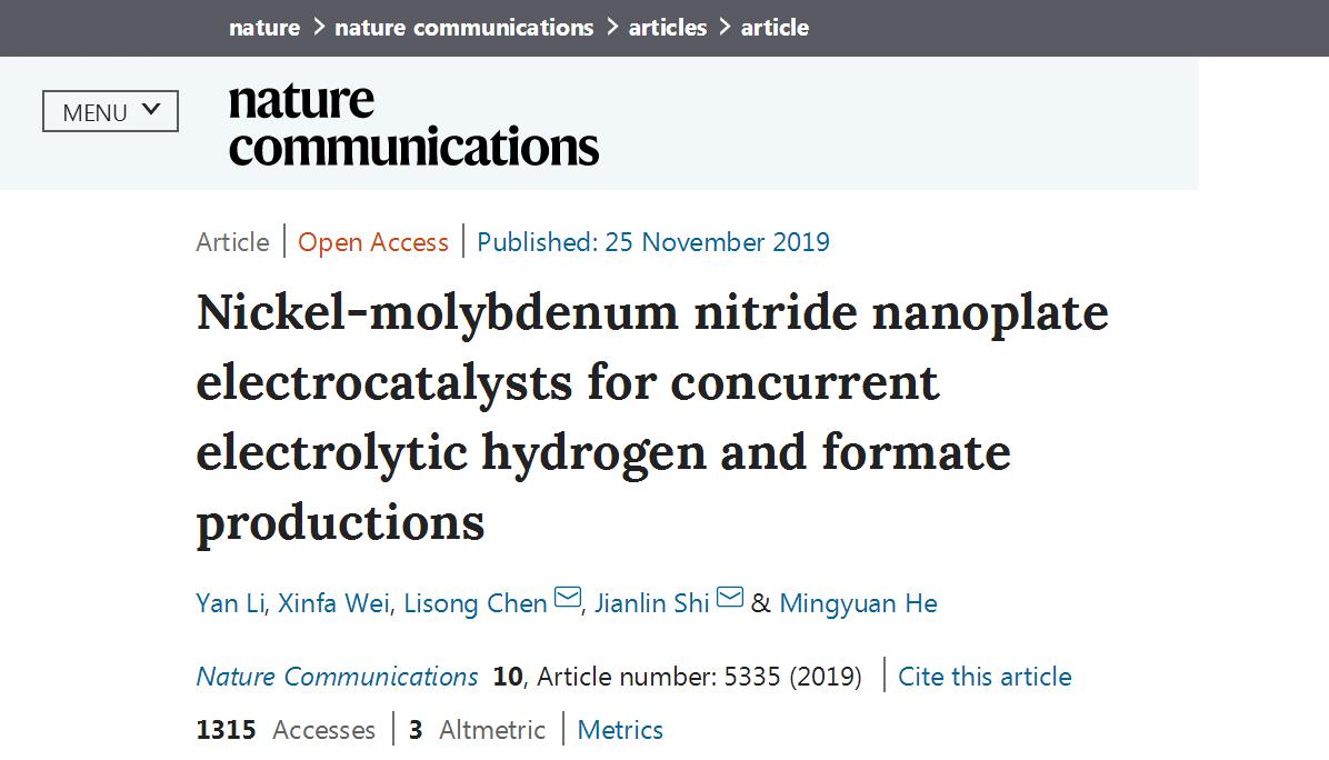 近日,华东师大化学与分子工程学院上海市绿色化学与化工过程绿色化重点实验室特聘教授施剑林院士与青年教师陈立松博士在有机物辅助电催化析氢领域取得重要进展。研究成果以“Nickel-molybdenum nitride nanoplate electrocatalysts for concurrent electrolytic hydrogen and formate productions”为题发表在《自然•通讯》(Nature Communications)上(Nat. Commun, 2019, 10, 5335)。