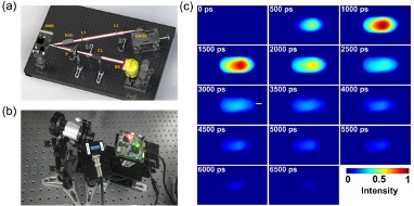 超快电光偏转成像示意图(a)和实验装置图(b)染料分子(罗丹明B)瞬态发光动力学成像(c)