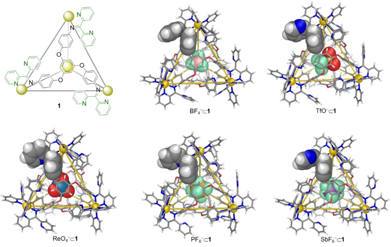 最近,徐林教授课题组将研究对象从二维超分子金属大环拓展到三维超分子金属笼。通过模仿生命体系中pH对生理功能的调控,利用配位键导向自组装策略,构筑了一系列具有酸碱刺激响应性的超分子金属笼,该类金属笼的结构均通过单晶X-射线衍射进行了确证(图3)。