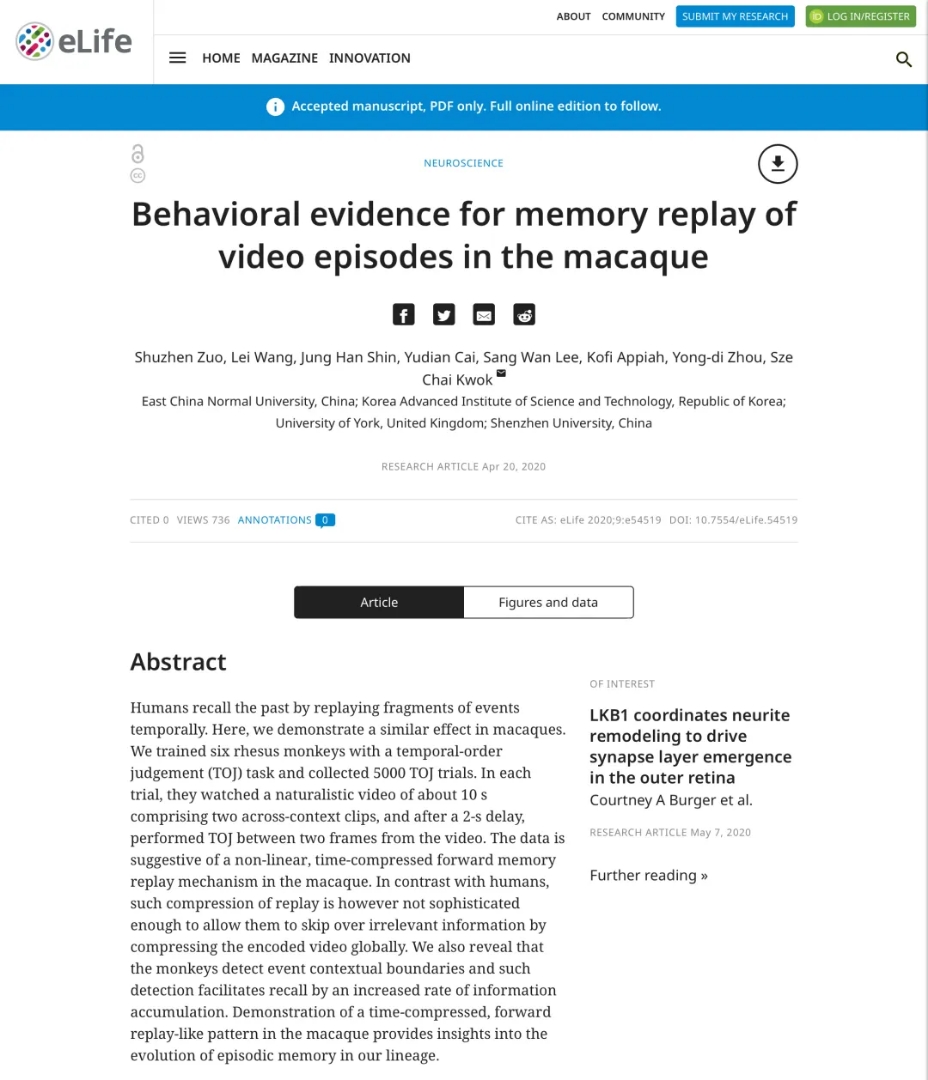 该研究于2020年4月20日以 Behavioral evidence for memory replay of video episodes in the macaque为题在Nature Index收录期刊eLife(2018 IF =7.551)上发表。(点击图片直链论文)