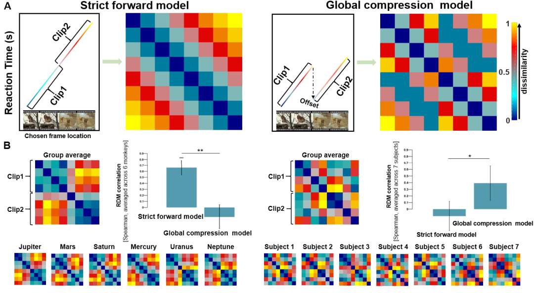 研究者提出了两个理论模型。如果猕猴具有像人类被试一样可以根据当前任务需要,自如地跳过不必要的场景,那么对于第二段视频的回放将不会受到第一段视频的影响,对第二段视频的信息提取所需的时间理论上也应相应地缩短(Global-compression model, 图三A右)。