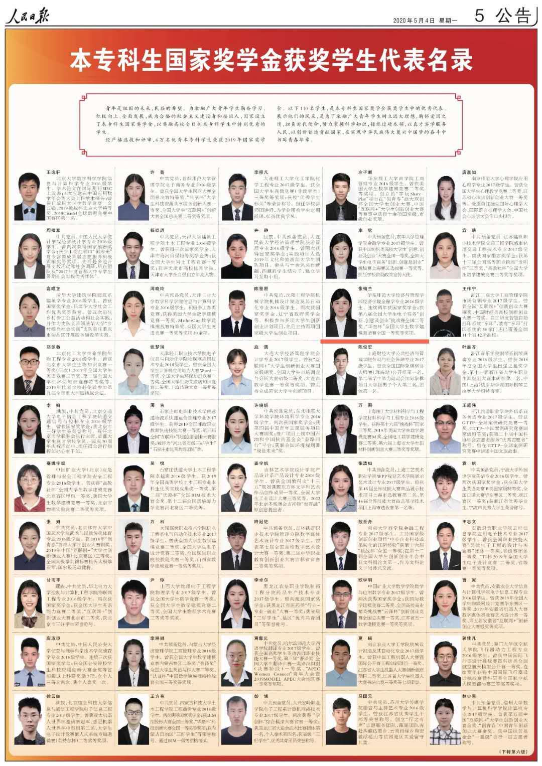 澳门永利皇宫官网入口经济与管理学部经济学院金融学专业2016级本科生张梅兰,作为2019年全国60000名国家奖学金获得者中的110位优秀代表之一,登上了5月4日青年节人民日报专版:《本专科生国家奖学金获奖学生代表名录》。