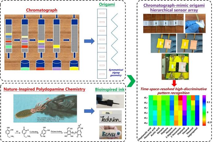 综上所述,张闽及其合作者通过将仿生纳米材料制备及表面改性、折纸传感阵列、数据挖掘等技术相结合,制备功能导电墨汁并构筑具有时空分辨仿色谱特性的折纸递阶型多功能传感器件,应用于复杂物理和化学刺激的区分及检测分析,为未来可穿戴和便携式电子设备的可扩展和低成本开发提供技术支撑和有效的解决方案。