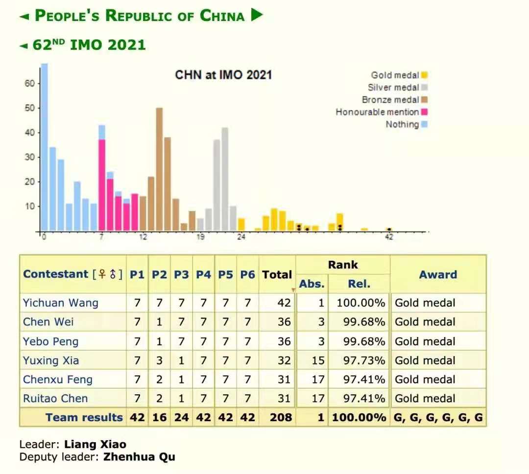 第62届IMO中国国家队成绩单