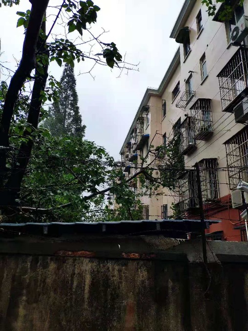中北校区对外汉语楼与隔壁居民区相邻处,一棵高15米、宽11米的超大构树树枝断裂。倒伏原因:起加固作用的桩移位,钢丝绳断裂。