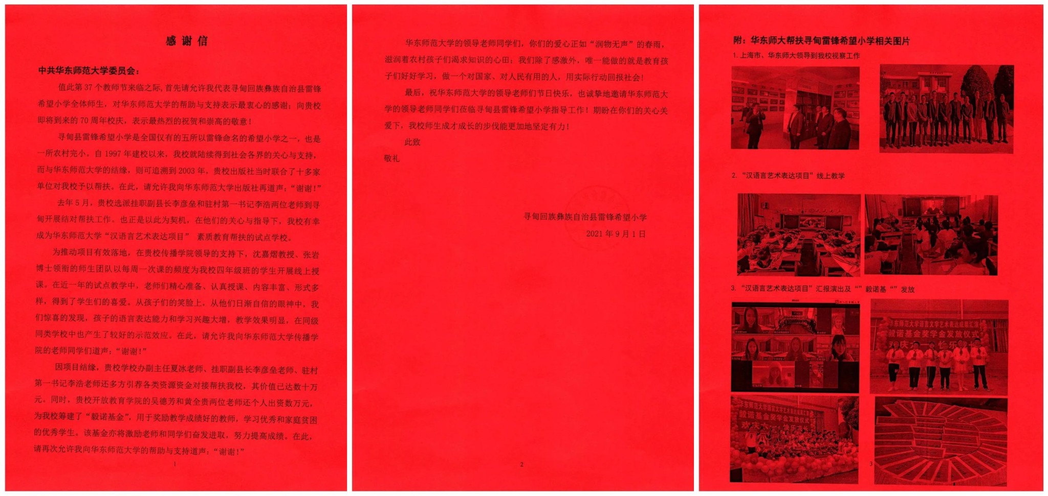 第37个教师节前夕,华东师大收到了一封来自云南省寻甸县雷锋希望小学的感谢信,信中写道:“你们的爱正如润物无声的春雨,滋润着农村孩子们渴求知识的心田。我们除了感激外,唯一能做的就是教育孩子们好好学习,做一个对国家、对人民有用的人,用实际行动回报社会!”质朴的语言传递真挚的情感,将华东师大与雷锋希望小学持续近20年的情谊娓娓道来。