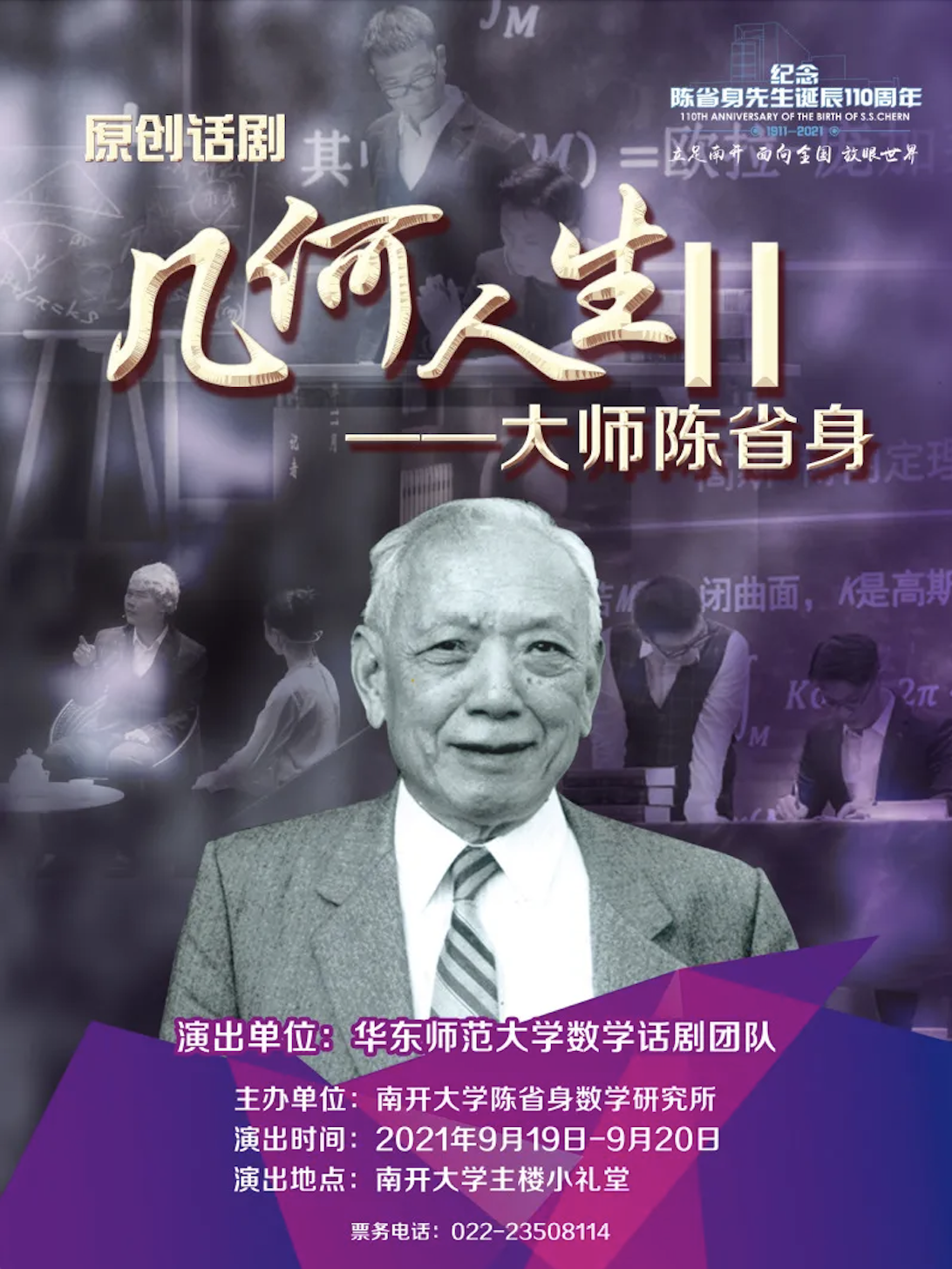 今年是数学大师陈省身先生诞辰110周年,受南开大学陈省身数学研究所邀请,澳门永利皇宫官网入口数学科学学院话剧团队编排的《几何人生II——大师陈省身》,中秋假期在南开园上演。