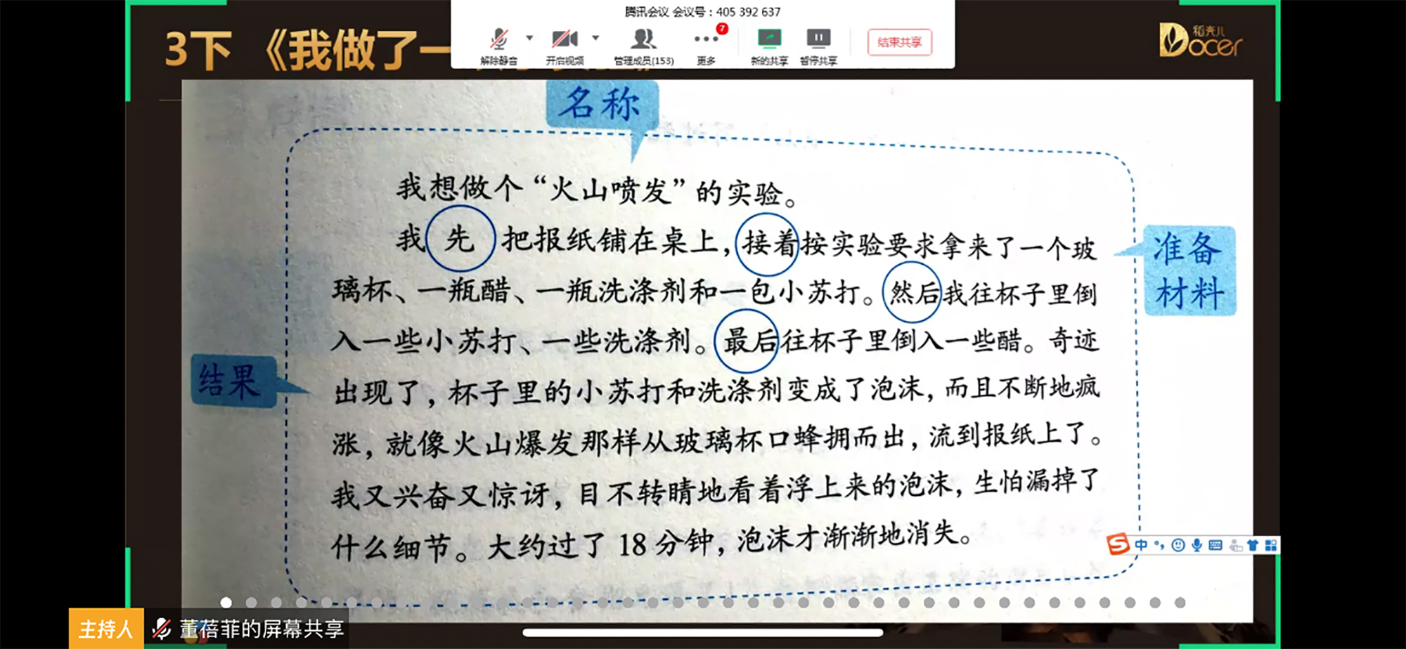 3月18日下午,小学语文组借助腾讯会议平台,以网络直播的方式开展了“清单习作教学设计”的线上教研工作坊。来自各地的澳门永利皇宫官网入口附属联盟校,以及部分兄弟学校共计150余名教师,共聚云课堂、探讨作文教学。