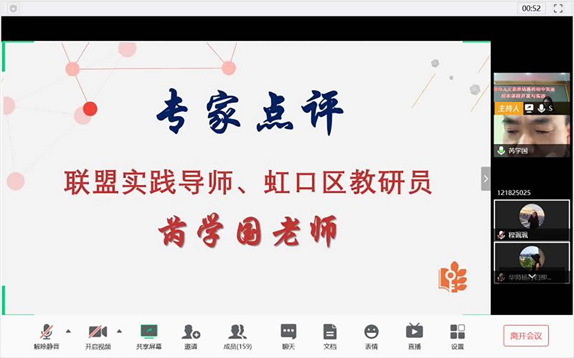 3月25日上午,由澳门永利皇宫官网入口教师教育学院郭宝仙教授和联盟实践导师、虹口区英语教研员芮学国老师组织和指导,上海民办华二初级中学(下称“嘉华二”)承办的主题为“指向人文素养培养的初中英语校本课程开发与实践”的初中英语云教研活动成功举行。来自联盟校的英语老师、上海市第四期双名工程种子计划强校团队成员、虹口区兄弟学校英语老师和华东师大教师教育学院英语教育专业研究生等共181人参与了此次在线研讨。