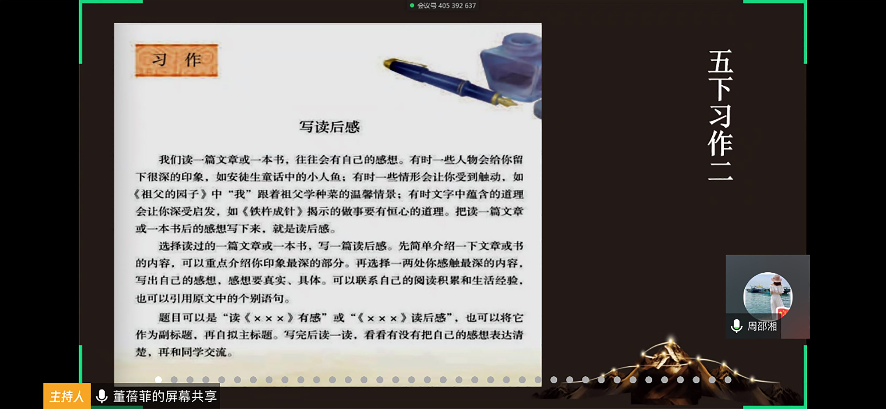 董教授以五年级《写读后感》为例,向大家展示了习作清单的构成要素和设计流程。在此基础上,又通过小学语文二、三、四、六年级习作清单的案例,生动展示了如何将清单习作的四环节运用于实践教学之中。在此过程中,董教授注重网络教研中小步递进的学习方式,循序渐进地设置了多项随堂练习,帮助各附校教师们通过完成一个个小任务,充分理解和掌握清单习作的教学步骤。