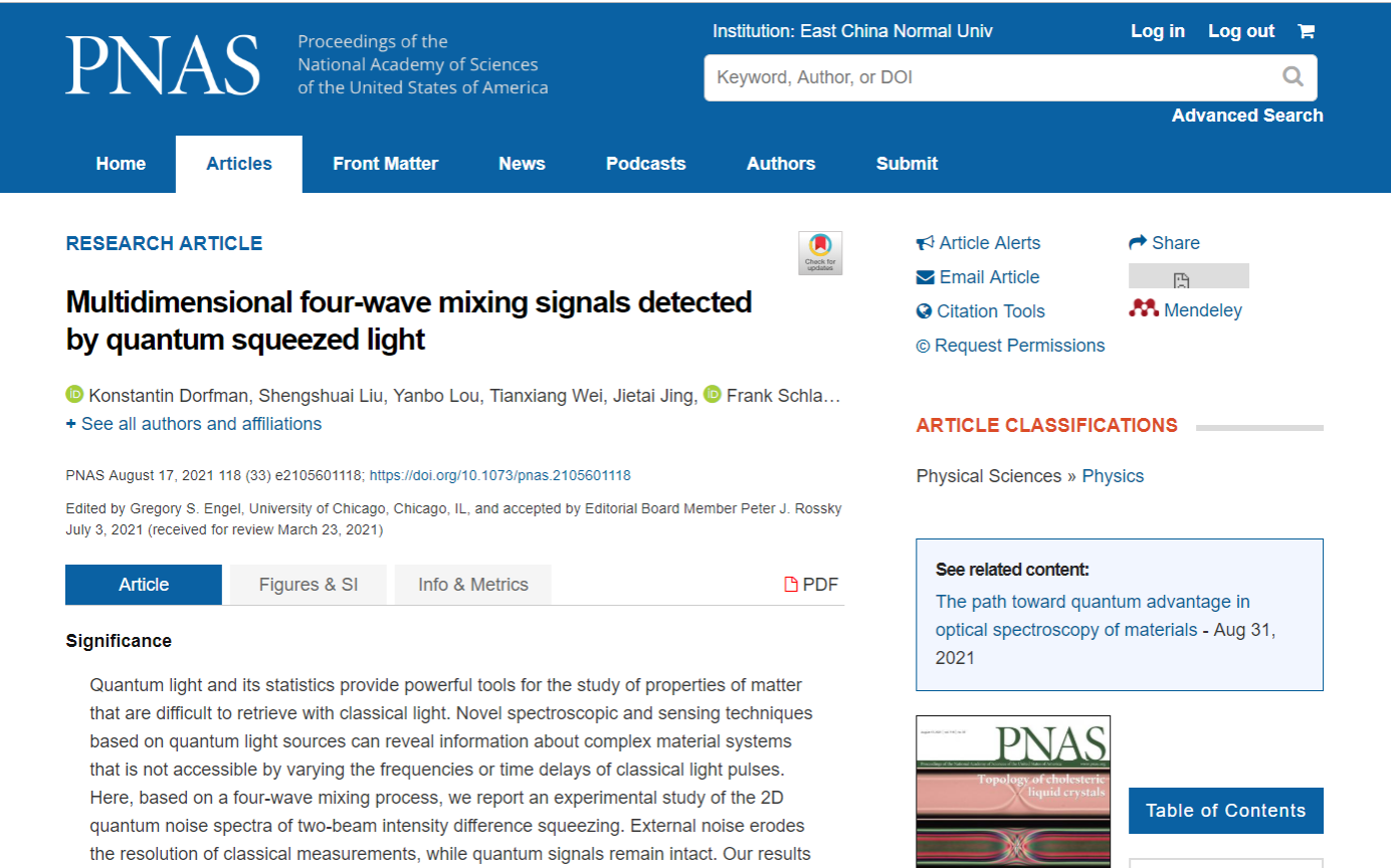 相关结果以“Multidimensional four-wave mixing signals detected by quantum squeezed light”为题发表在国际著名学术期刊《美国国家科学院院刊》(Proceedings of the National Academy of Sciences of the United States of America)PNAS118,e2105601118 (2021)上。这项工作是在Konstantin E. Dorfman教授、荆杰泰教授、Frank Schlawin博士以及Shaul Mukamel教授的合作下完成的。Shaul Mukamel教授是华东师大的客座教授。澳门永利皇宫官网入口为第一完成单位,精密光谱科学与技术国家重点实验室的Konstantin E. Dorfman教授、刘胜帅副研究员和娄彦博博士为论文共同第一作者,魏天祥硕士对实验部分也作了重要贡献,Konstantin E. Dorfman教授和荆杰泰教授为论文的共同通讯作者。
