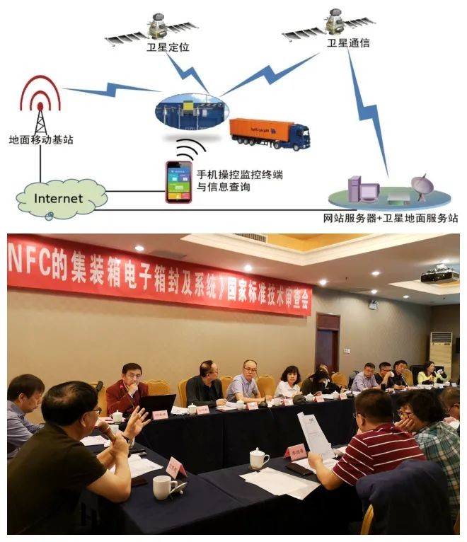 华东师大包起帆团队领衔并参与国际标准制修订,使中国北斗系统运用于全球集装箱物流跟踪。图为系统示意图以及集装箱电子箱封国家标准通过技术审查。