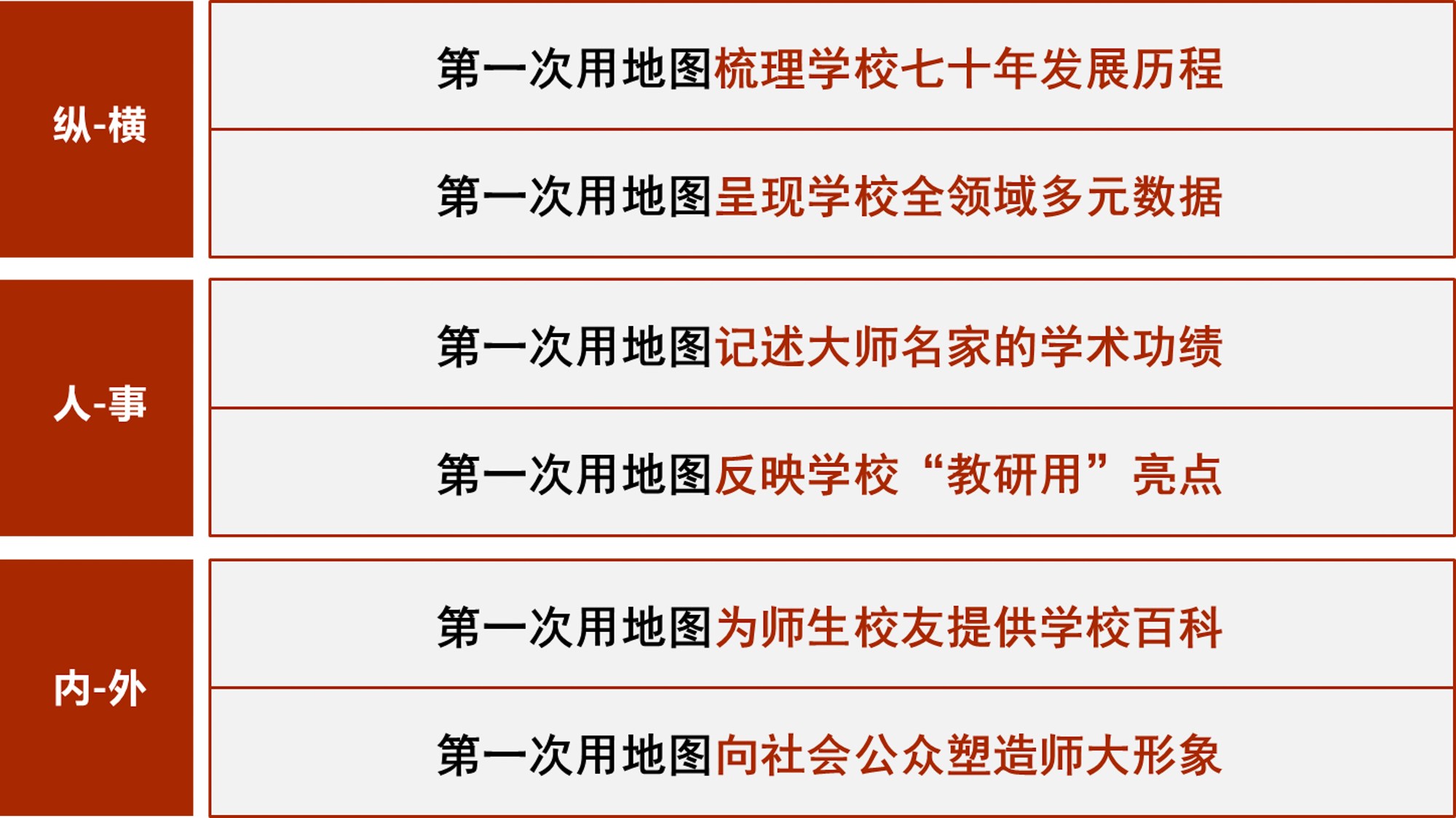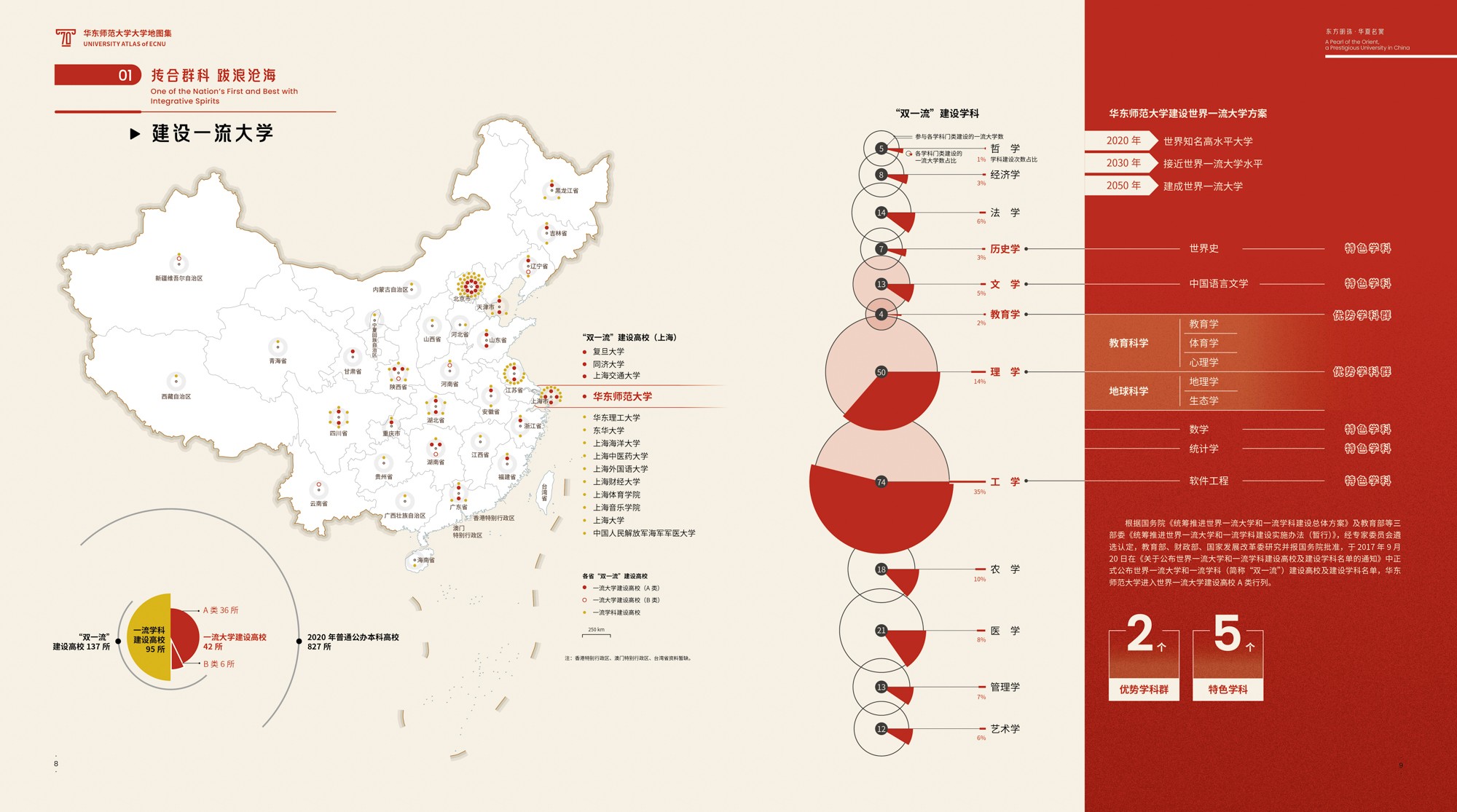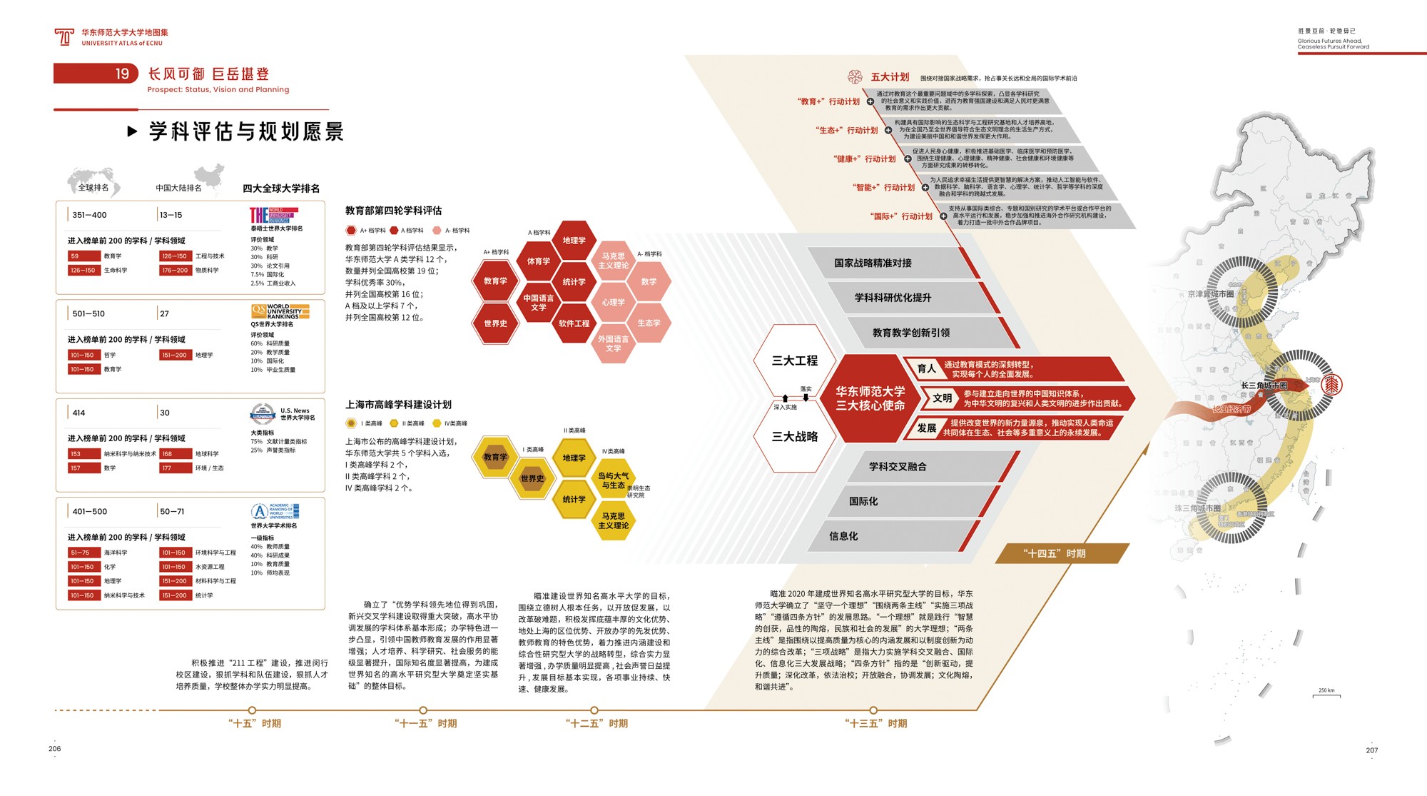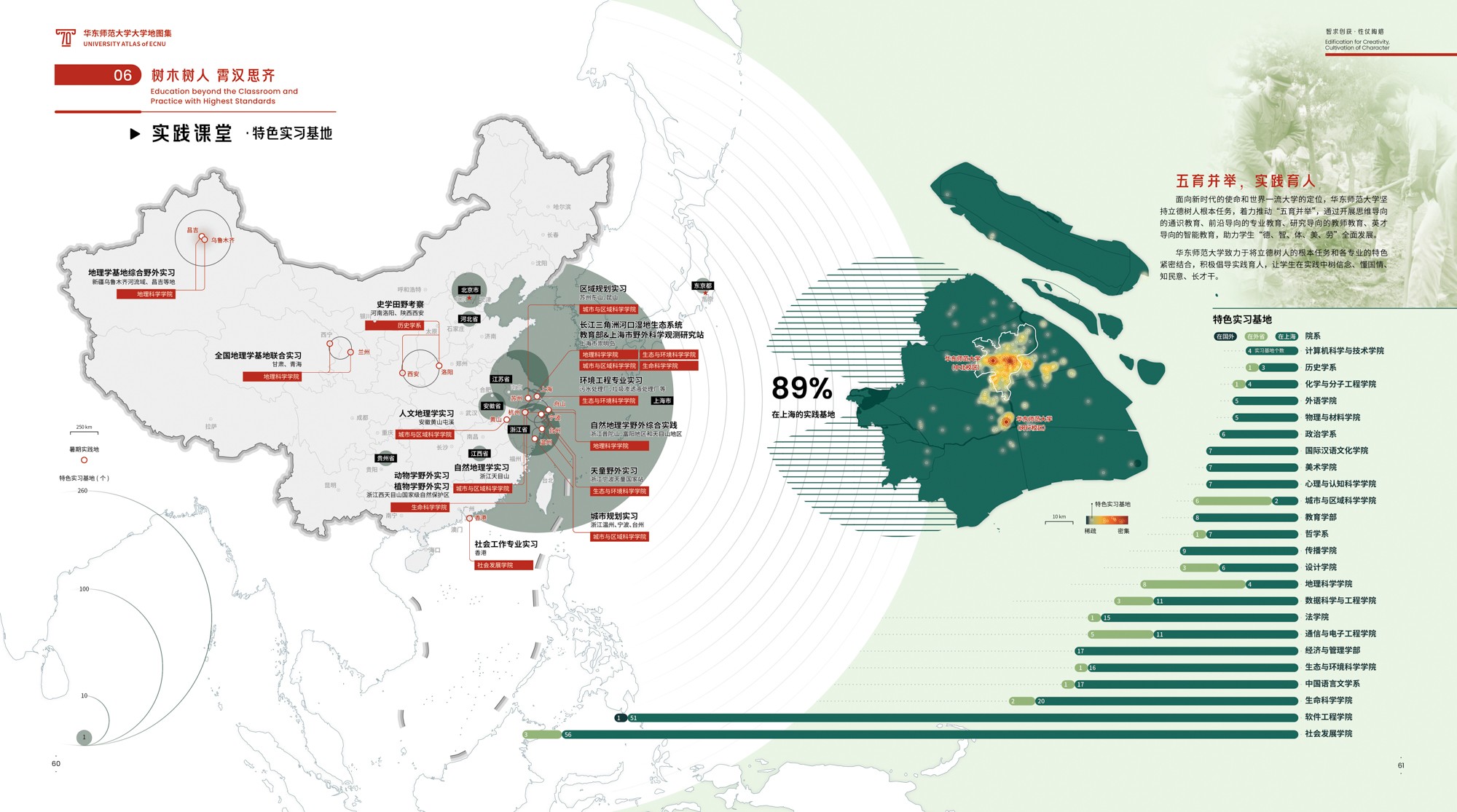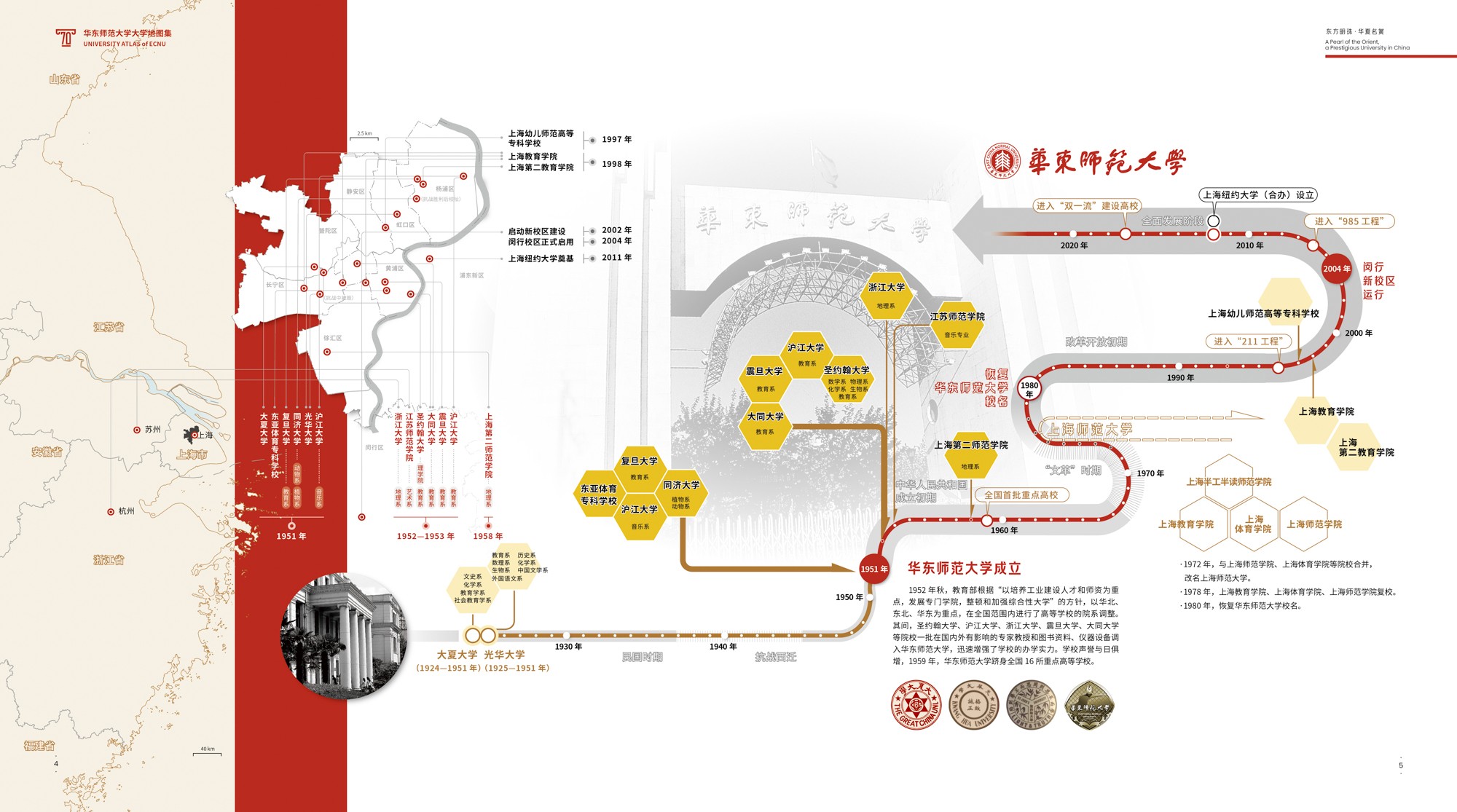 《地图集》围绕华东师大70年发展轨迹展开,共6篇19章,各篇章内容均有明确的主题,篇与章的命名主要取自华东师大 “大师石”《闵行校区勒石铭》 铭文。各篇篇名分别为“东方明珠·华夏名黉”“智求创获·性仗陶熔”“图新稽古·寰宇争高”“教之祈向·国之盛隆”“美丽校园·优雅学府”“胜景亘前·轮驰毋已”。内容主体部分为(第2-4篇),分别围绕大学“人才培养、科学研究、社会服务”等基本职能展开,第5篇承载传统校园物理空间,第1篇和第6篇前后呼应,从时间维度彰显文脉传承,6篇共同构成大学地图集叙事框架。