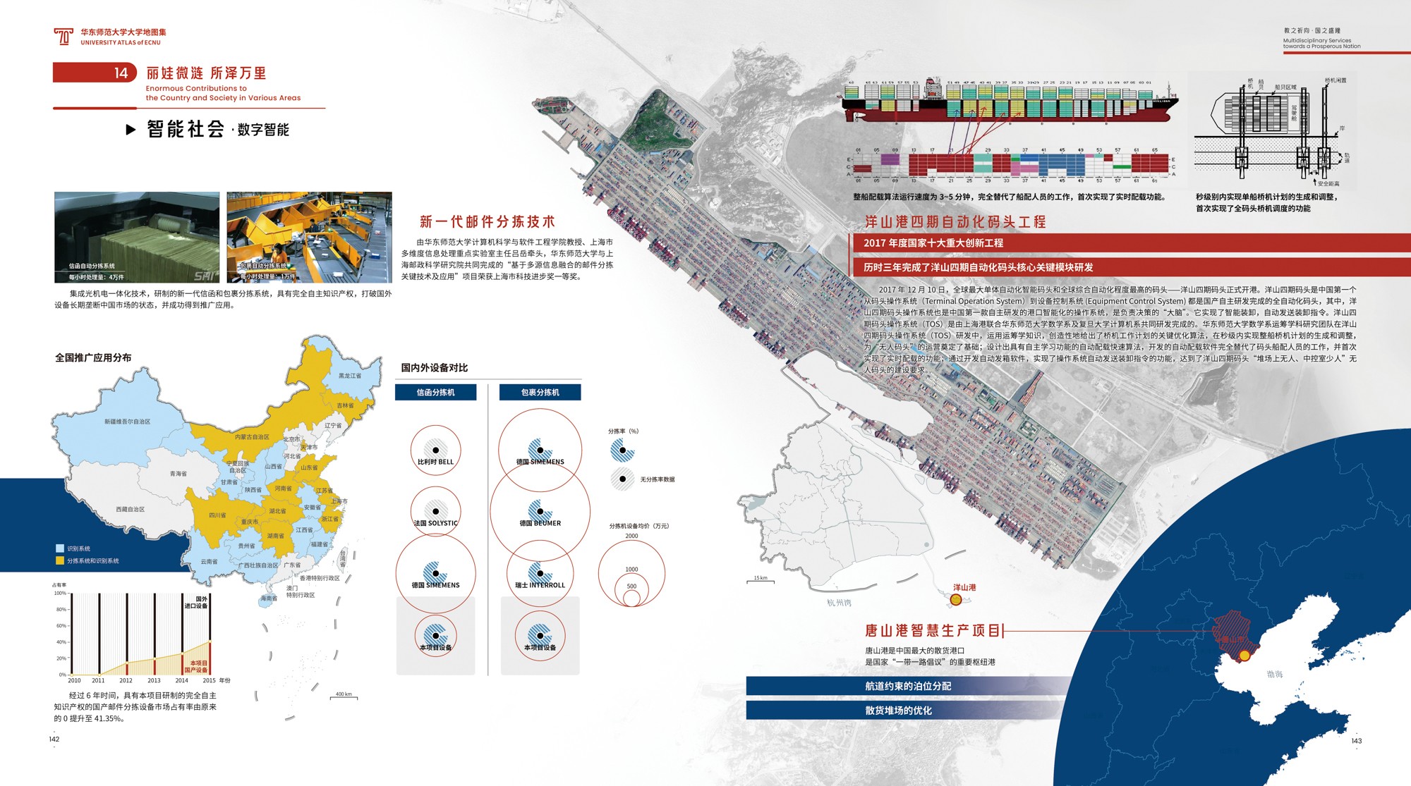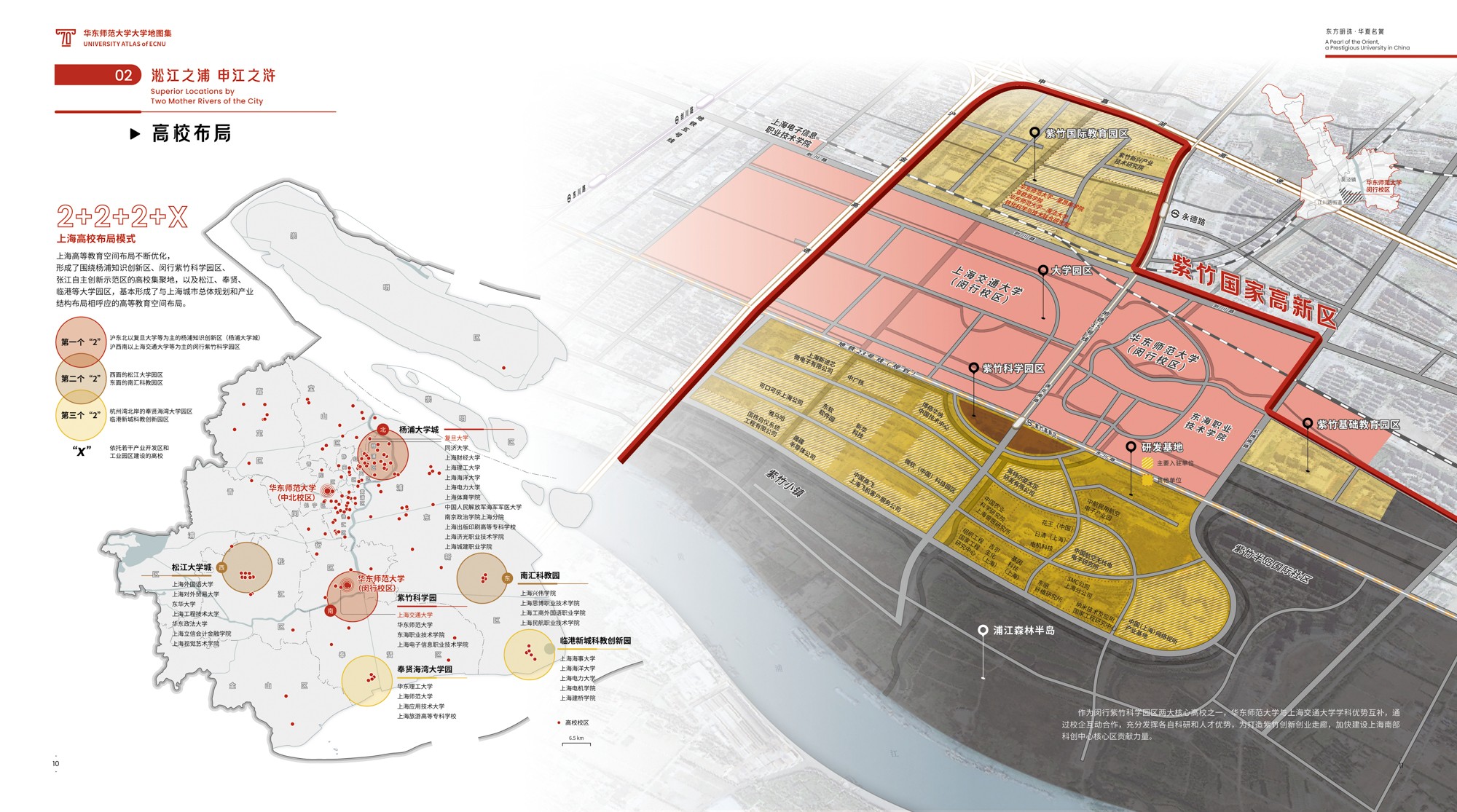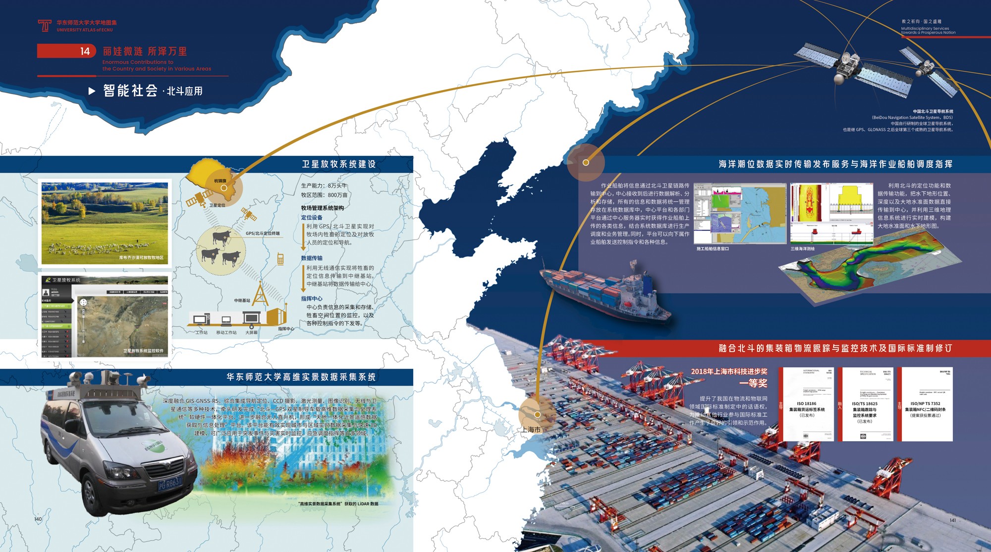《地图集》主创之一、华东师大地图研究所唐曦副教授表示,这种“综合”表达系统,既是“空间的”,涉及全球、全国、上海和校园等各级地理尺度,又是“时间的”,跨越70载的历史回溯、当下呈现和远景展望;既是“素材的”,耦合地图、影像、统计图表、手绘图示、解说文字等不同表达形式,也是“视角的”,兼顾“横纵交叉”与“点面结合”,实现“上下贯通”与“内外联动”。