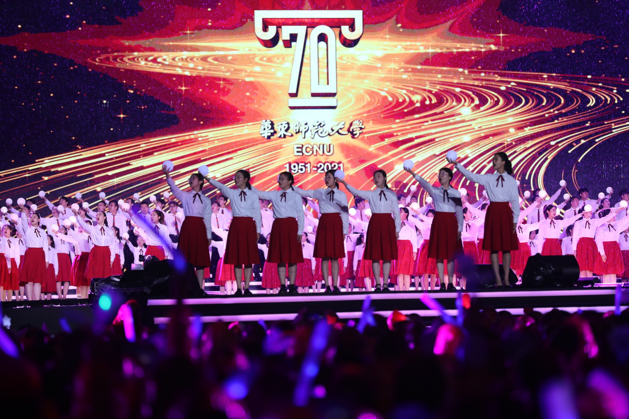 晚会上,校庆歌曲《上善若水》《薪火相传天地间》讴歌华东师大人的智慧与品格,舞蹈《流光叙》演绎流水的宽厚与温润、不息与坚韧;歌舞组合《时光》梦回校园青葱岁月,在《爱在华师大》的歌声中,70位华东师大人分享“爱上华师大”的70个理由。奋进与温暖交织,展现师大人七十载上下求索的奔涌故事。