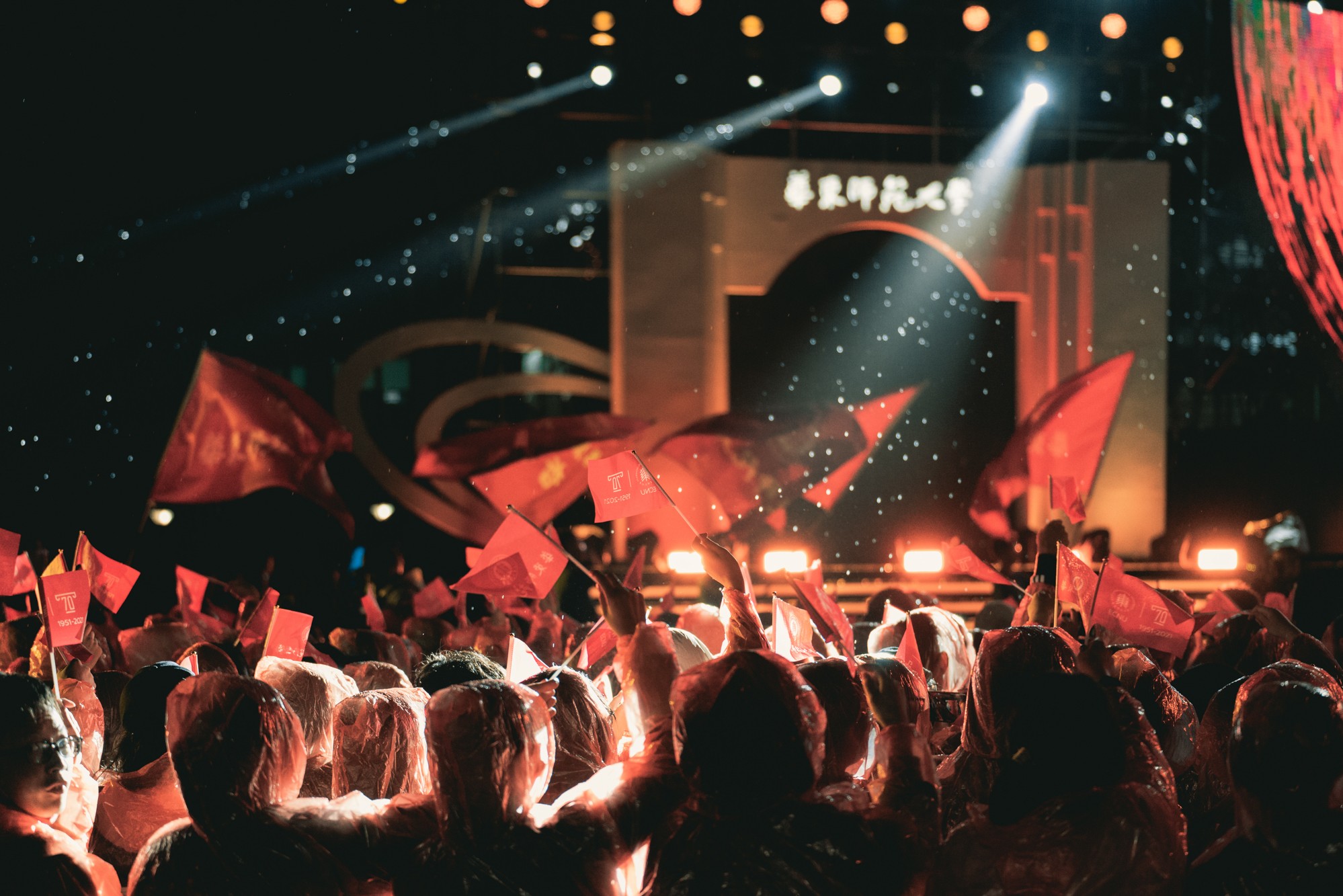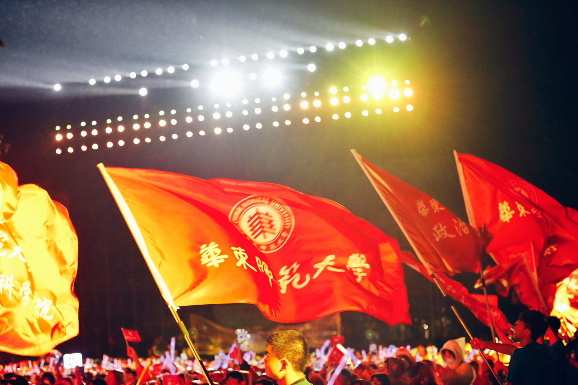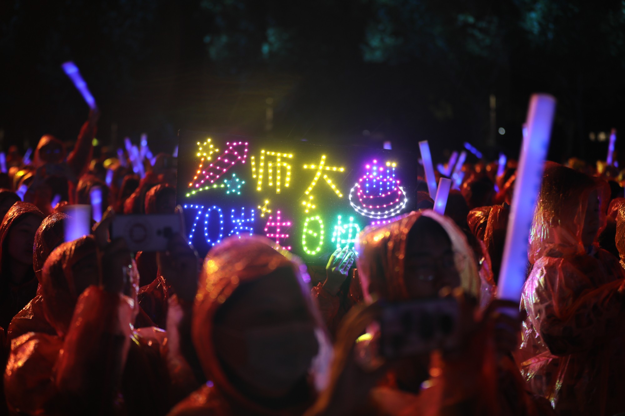 求实成就卓越,教育创造未来。演出尾声,800架无人机由“穿越千机”无偿捐赠,璀璨升空,宛若繁星,照亮樱桃河的夜空。无人机编队飞行表演《华夏之光》,通过勾勒校门、群贤堂、校徽、70周年标识、荷花、幸福花狮等元素变化,祝福华东师大生日快乐。