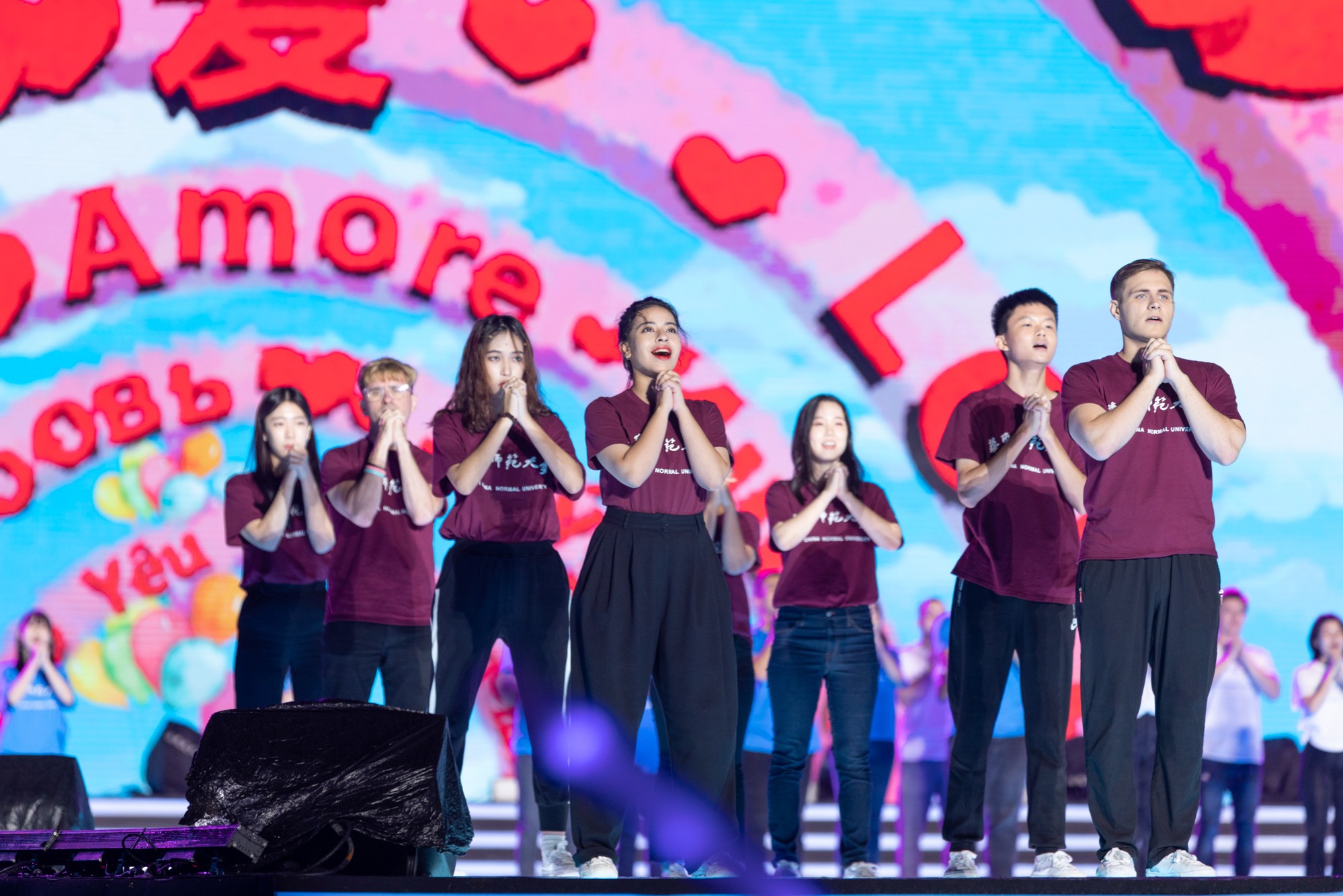 在“中流击水”“川流不息”“奔流向海”三个篇章中,以校友林海、赵梦然与学生杨晨、龙文萱为讲述人,千余名师生演员走心呈现了一场以音、画、诗、舞、歌结合的沉浸式演出。