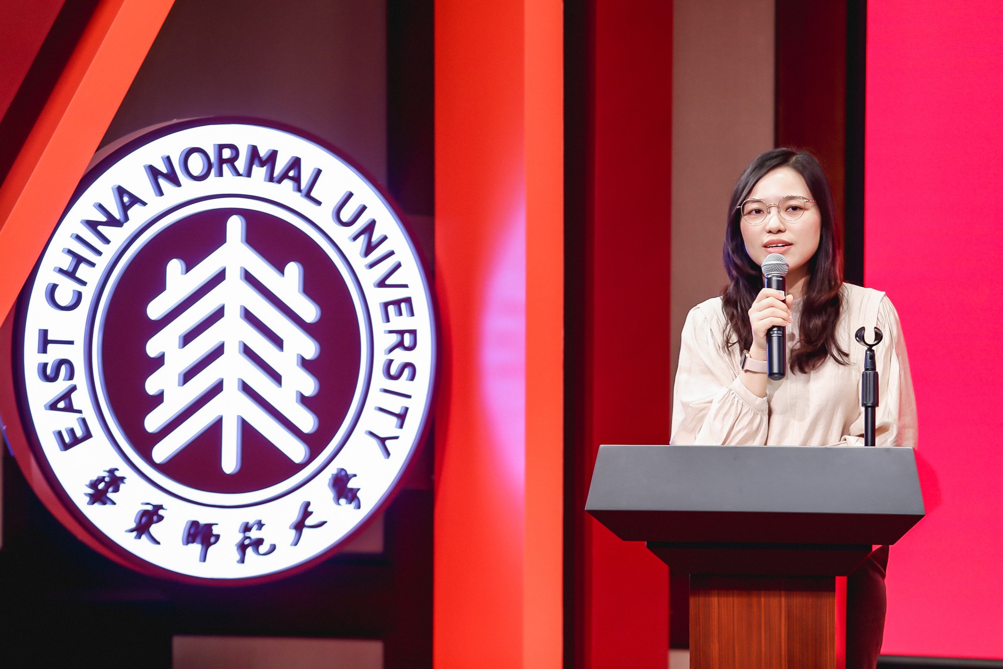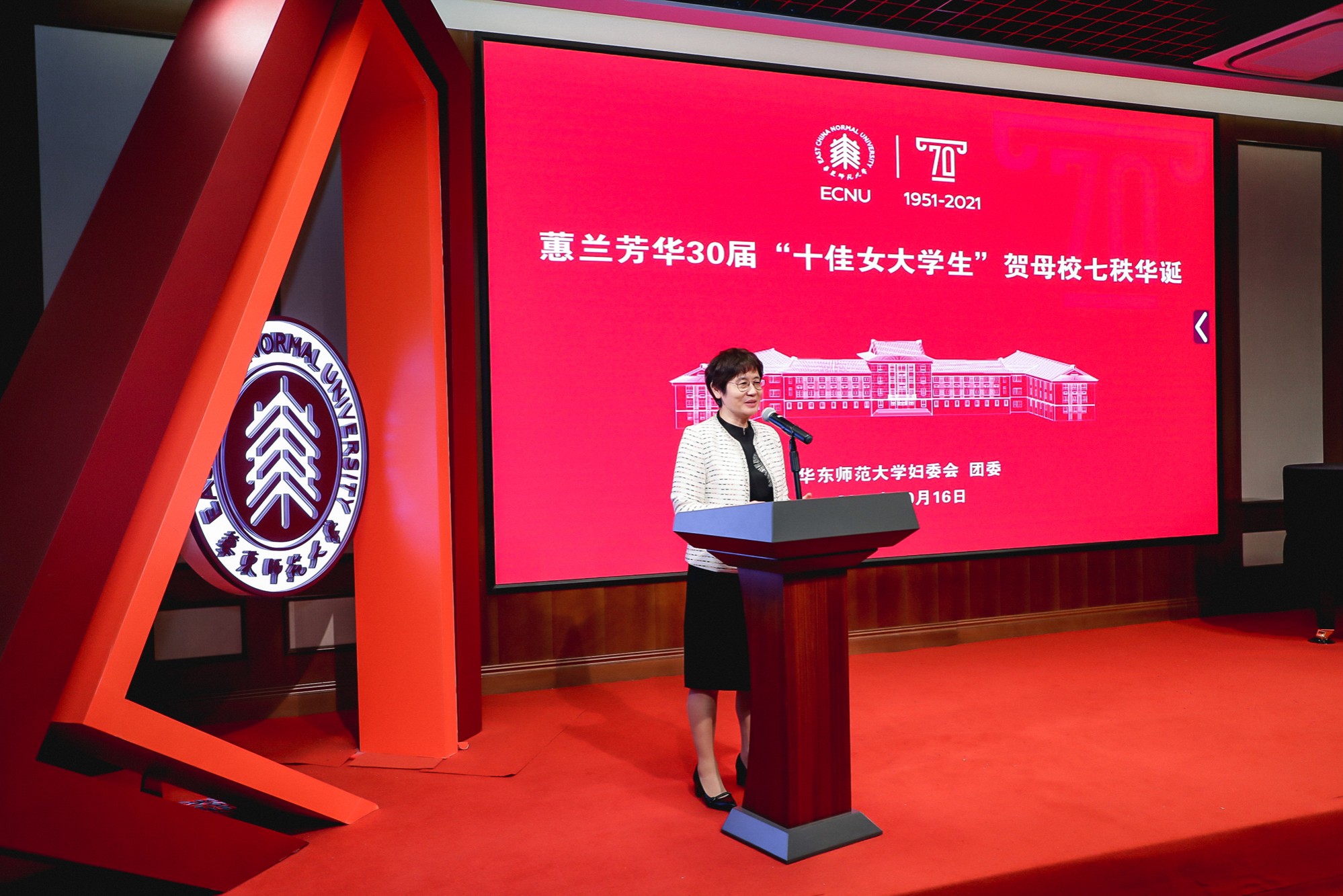 历届“十佳女大学生”代表们也纷纷上台发言,与在场的学姐学妹们一同重温师大记忆,共叙同窗情谊,并表达了对师大70华诞的祝福。1991年第一届十佳女大学生、广东外语外贸大学留学生教育学院院长蔡红说道,这么多年来,“十佳女大学生”称号赋予她“佳人”的意义,那就是追求真、善、美、爱,无论走多远,都不忘初心;无论多迷茫困顿,都用温柔的力量坚持内心的骄傲。作为1994年和1998年两届“十佳女大学生”,我校体育与健康学院汪晓赞教授也在活动中讲述了自己在丽娃河畔求学、工作和科研历程,她引用《诗经》“所谓伊人,在水一方”的诗句,指出丽娃河畔的“伊人”们,自信、坚定、温柔,展现了女大学生最美好的模样。她还提到在师大与体育结缘的故事,幽默风趣的语言让全场响起阵阵欢笑。2005年“十佳女大学生”、上海市徐汇区发展改革委员会何婷婷提起母校给予的三样最珍贵的东西:经历、思维方式和自我认知,“求实创造,为人师表”的校训引领着大家在各自的人生轨道上闪耀光芒。2012年“十佳女大学生”、上海房地产经营(集团)有限公司的闻贇也同样提及“十佳女大学生”们具有的聪慧、善良、自信的美好精神品质,激励着她在工作岗位上不断努力,不断突破,遇见更好的自己。