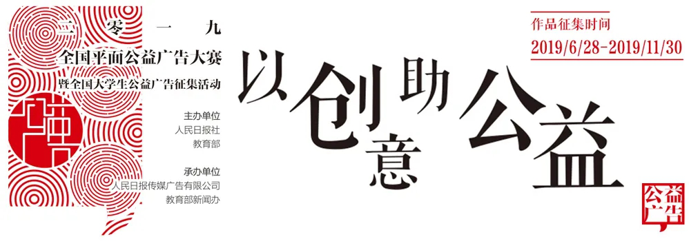 “2019全国平面公益广告大赛暨全国大学生公益广告征集活动”是由人民日报社、教育部联合主办,人民日报传媒广告有限公司、教育部新闻办承办的全国性公益广告赛事。本届活动依托融媒体传播优势,在全社会营造关注公益、参与公益的良好氛围,不断巩固奋斗新时代的思想基础,凝聚实现中华民族伟大复兴中国梦的强大精神力量,迎接新中国70华诞。