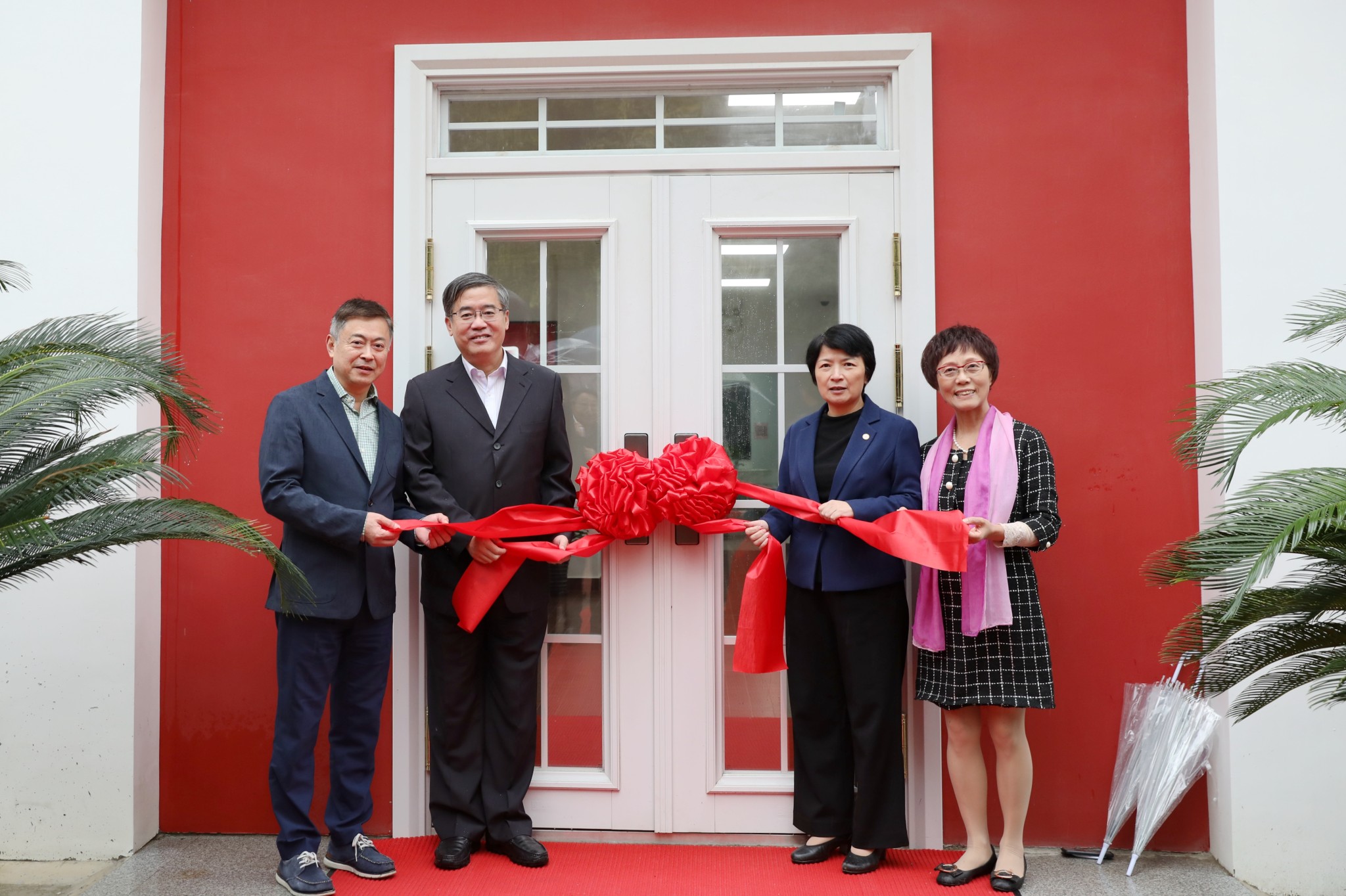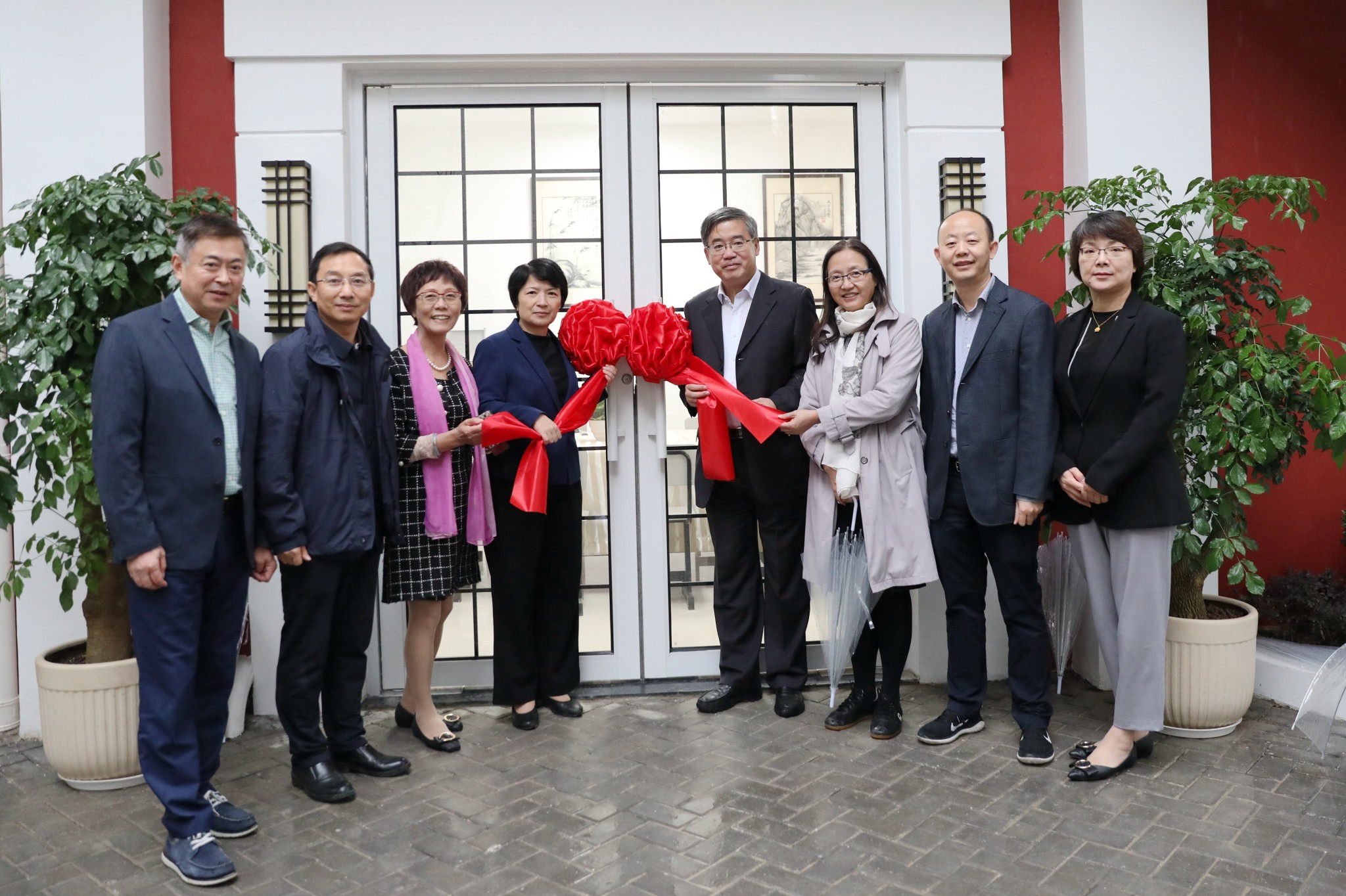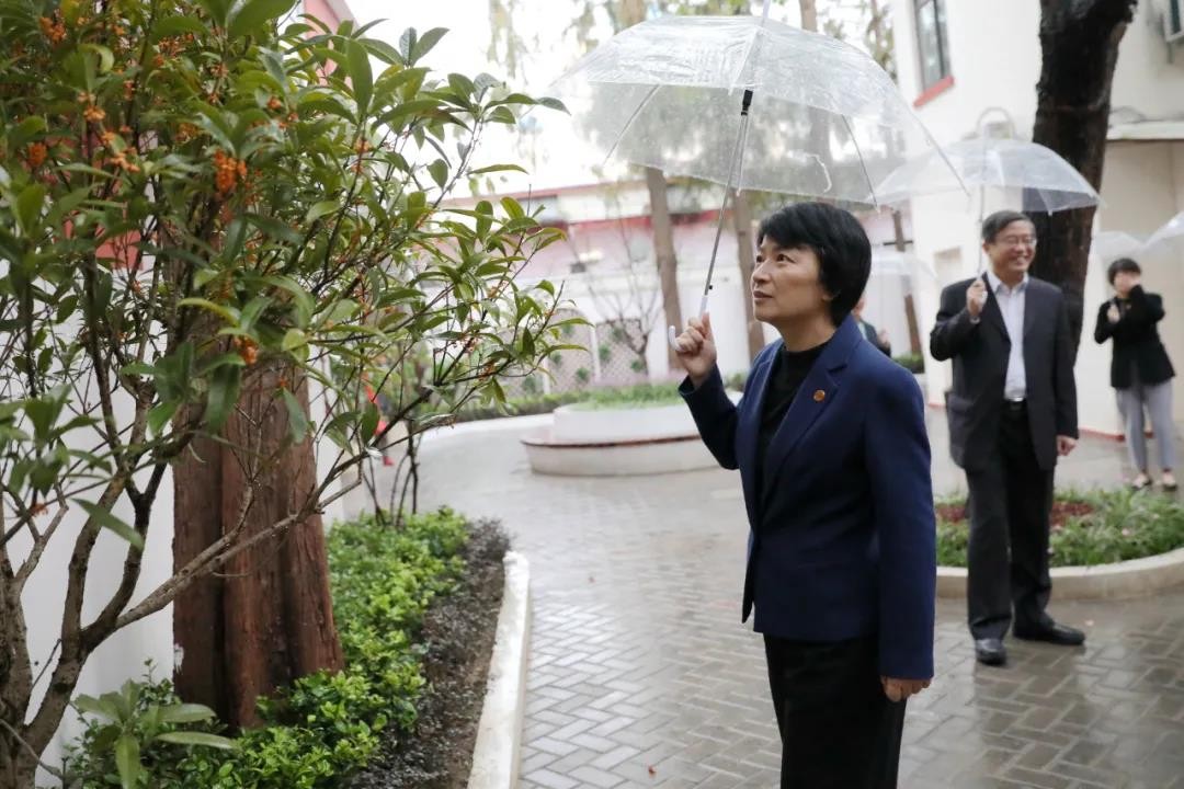 梅兵一行来到新落成的“退休教师之家”和“园丁雅苑”参观。裴建华详细介绍了庭院的设计理念和前后施工过程。梅兵、朱民等在“退休教师之家”门前共同开启华东师大退休教师的“幸福之门”。