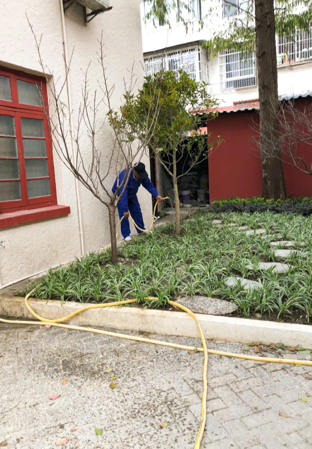 园丁雅苑周围有16棵参天水杉树,院子中央有一棵香樟树。院中还种有樱花、腊梅、枫叶、芭蕉、桂花等。正值丹桂飘香的季节,新植入的两棵桂花树散发着花香,令人陶醉。