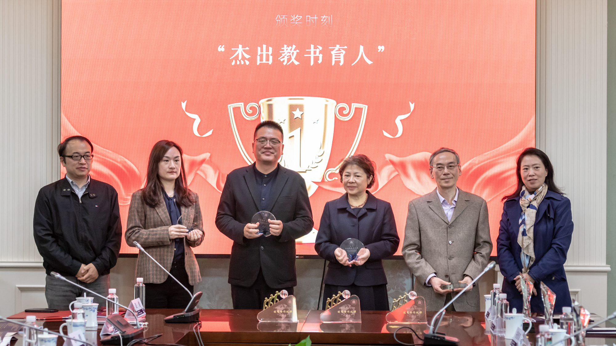 教务处副处长彭超、基础教育与终身教育发展部副部长韩楠为“杰出教书育人”奖获得者颁奖