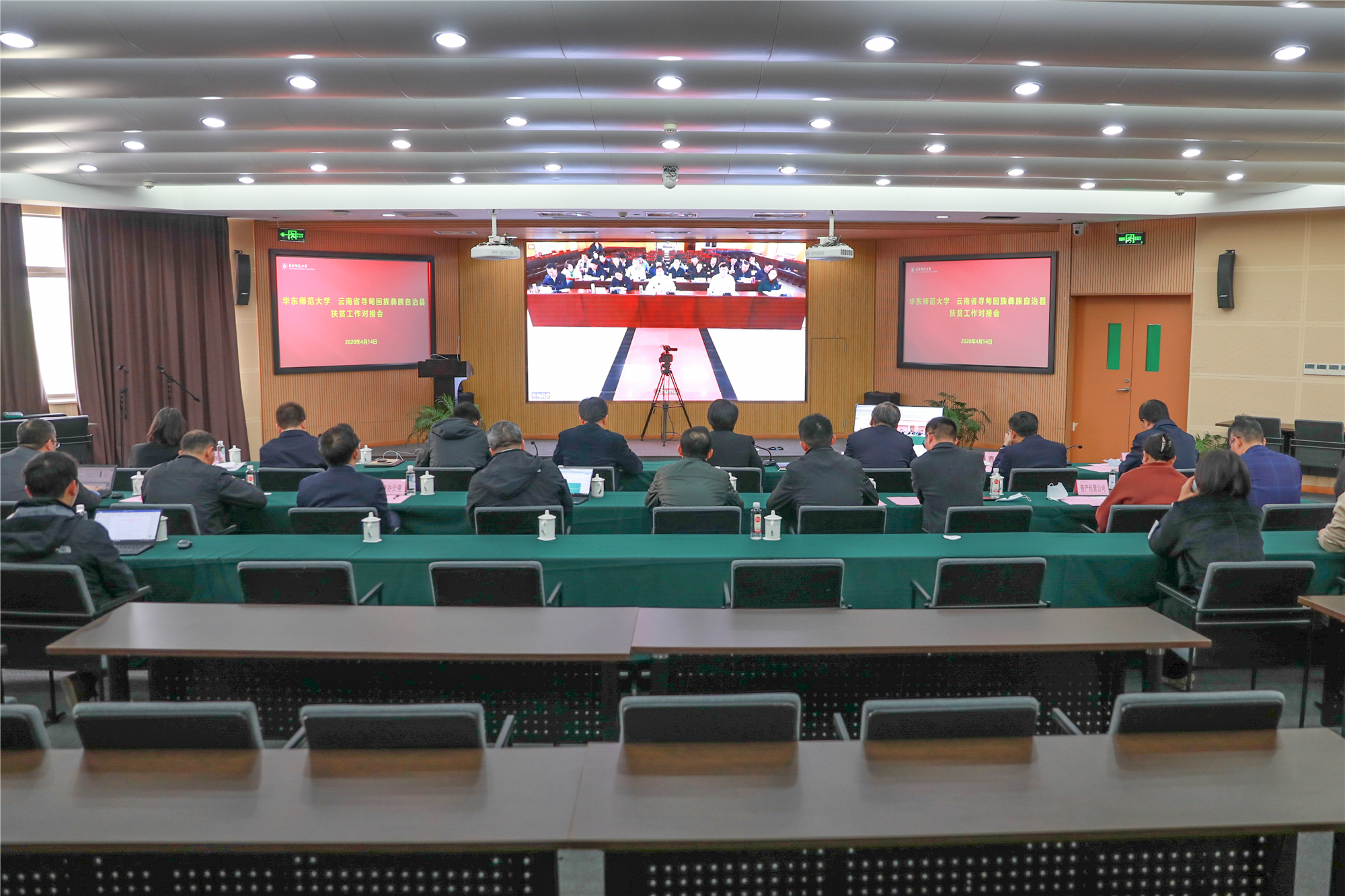 4月14日,澳门永利皇宫官网入口与云南省寻甸回族彝族自治县扶贫工作对接会以沪滇“屏对屏”的直播方式在“云端”举行。昆明市人大常委会党组成员、寻甸县委书记何健升,寻甸县长马郡,县领导王军、张永萍、肖正坤、李东华、张应良、方元升、董玉国、龙晶晶;华东师大党委书记梅兵,校长钱旭红,校领导朱民、王宏舟、曹友谊、孙真荣、李志斌、周傲英参会。寻甸县委副书记、县委党校校长王军,华东师大副校长孙真荣分别介绍县校脱贫攻坚、定点帮扶工作情况。会议由梅兵主持。
