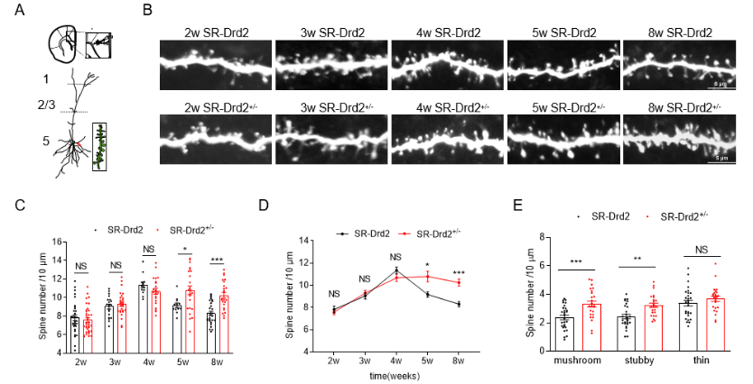 前扣带回皮层(ACC)是一个与情绪如焦虑和抑郁密切相关的脑区,研究者使用SR-Drd2+/-大鼠研究Drd2在ACC突触发育中的作用。研究者追踪了SR-Drd2大鼠和SR-Drd2+/-大鼠ACC第5层Drd2阳性神经元上树突棘的发育时程,发现Drd2在调节突触修剪而非突触形成中起到重要作用(图2)。此外,青春期Drd2介导的突触修剪缺陷会导致成年期神经元兴奋性增加和焦虑样行为。