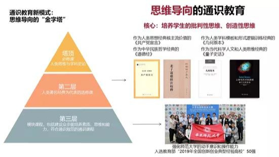 学校构建了以思维训练为特色的通识教育课程体系,整个体系犹如金字塔型,其中“人类思维与学科史论”课程群位于塔尖,旨在让学生跨越学科界限,引导学科交叉融合,从不同学科的历史发展中汲取“思维自由”的养分,已累计开设20门次,修读学生近600人。