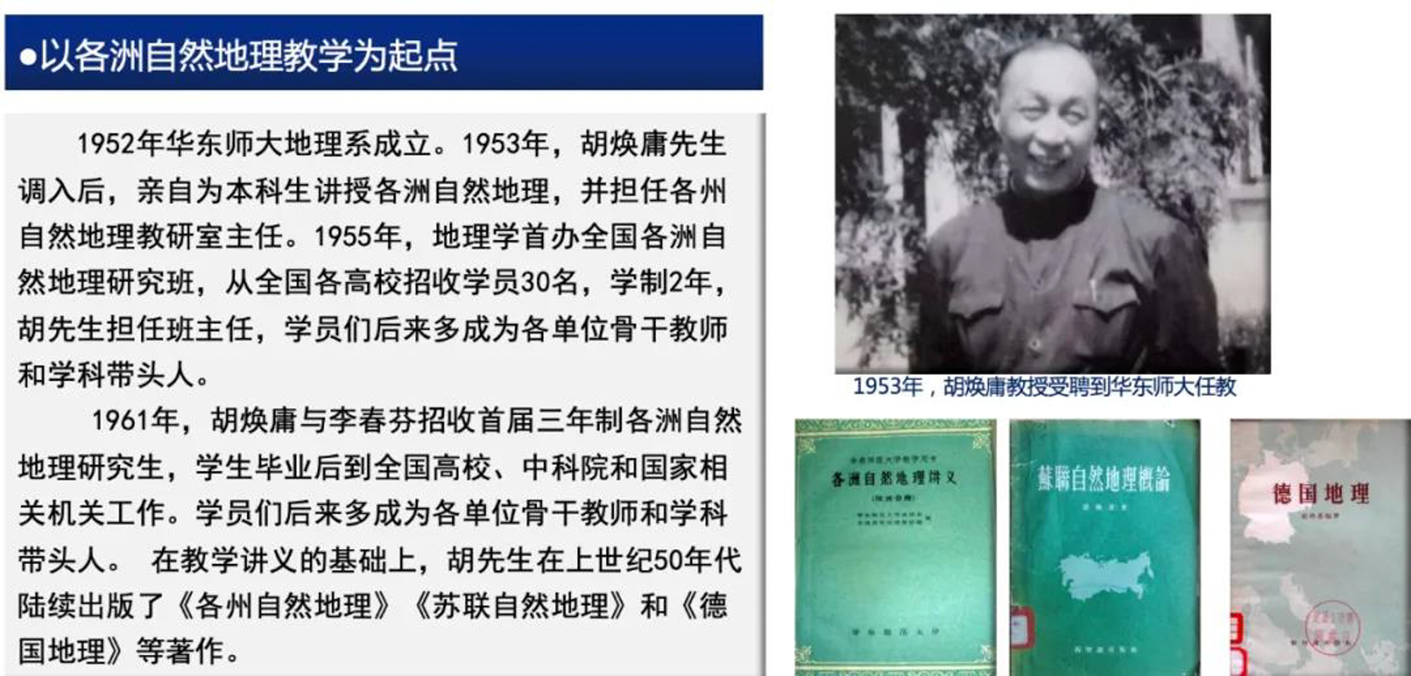 1953年,胡焕庸加入澳门永利皇宫官网入口地理系,即为本科生开设世界各洲自然地理课程,担任世界各洲自然地理研究生班的班主任,并招收世界地理方向的研究生。