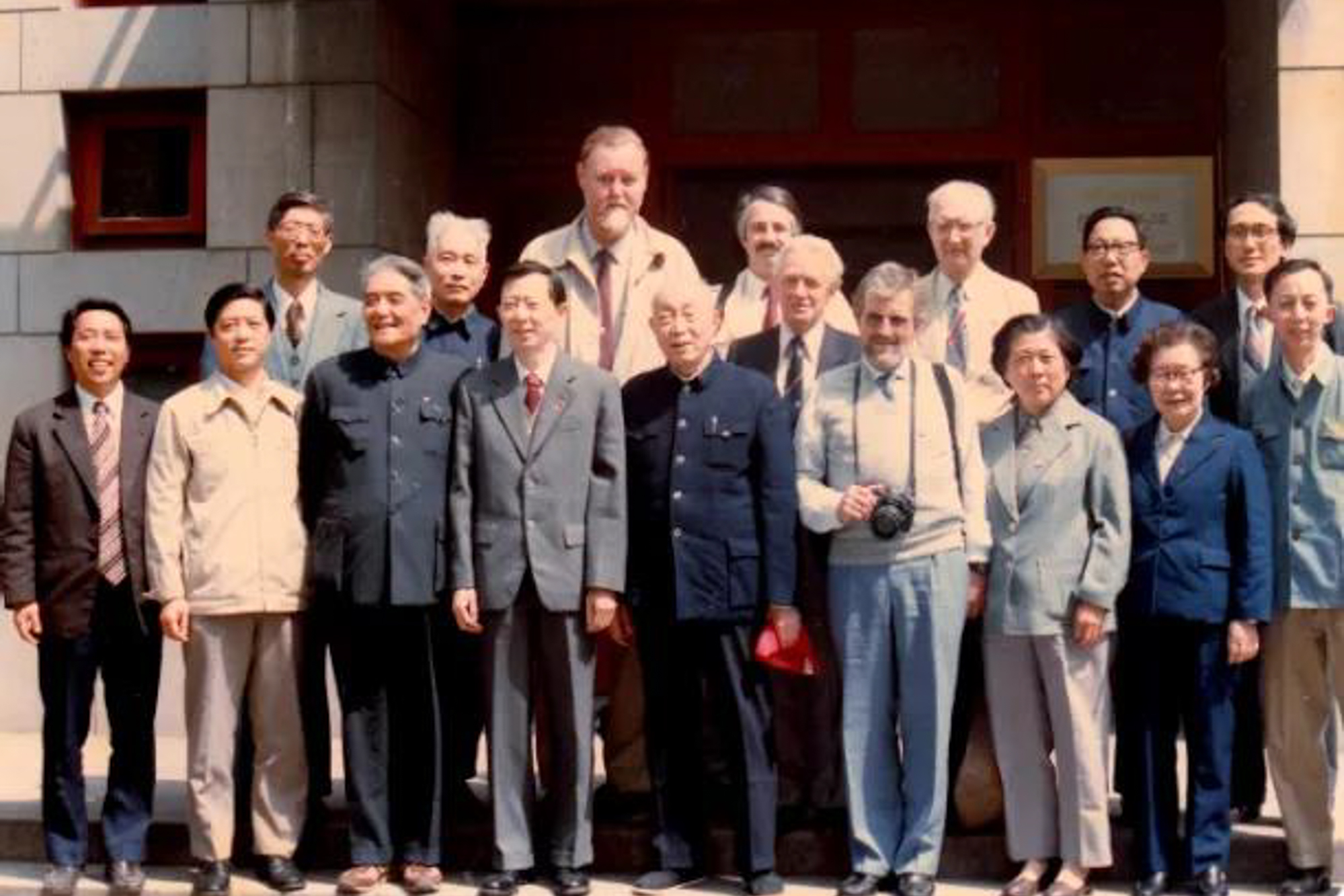 国际地理联合会(IGU)代表团访问华东师大(左五胡焕庸,前排左三李春芬,左四袁运开校长,前排右二严重敏,后排左二褚绍唐,1985年)
