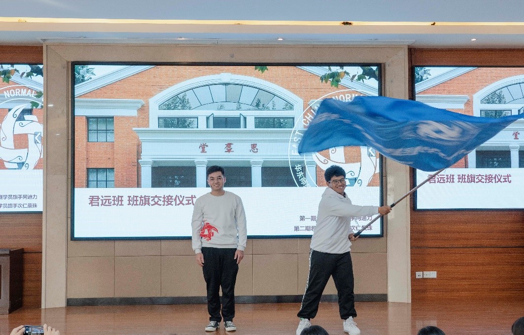 随后,宛姝为第一期君远班学员颁发结业证、优秀学员证,并对“君远班”的学员们表达了祝贺和深切的期望,希望学员们珍惜这段历程,把握机会,努力开拓。第一期与第二期君远班学员完成了班旗交接仪式后,2019级孟宪承书院地理科学专业的本科生赤列贡加作为第一期学员代表上台发言。他分享了自己一年来在君远班这个拥有文化特色的少数民族同学组成的集体中学习和生活的感受,并对学校和君远班给少数民族同学搭建了这样一个人才培养的平台,让自己能够站上更高的肩膀去眺望远方表示感谢,最后他对第二期君远班的学弟学妹们表达了祝愿,也期望君远班的同学们都能为学校、社会奉献自己更多的智慧与力量。
