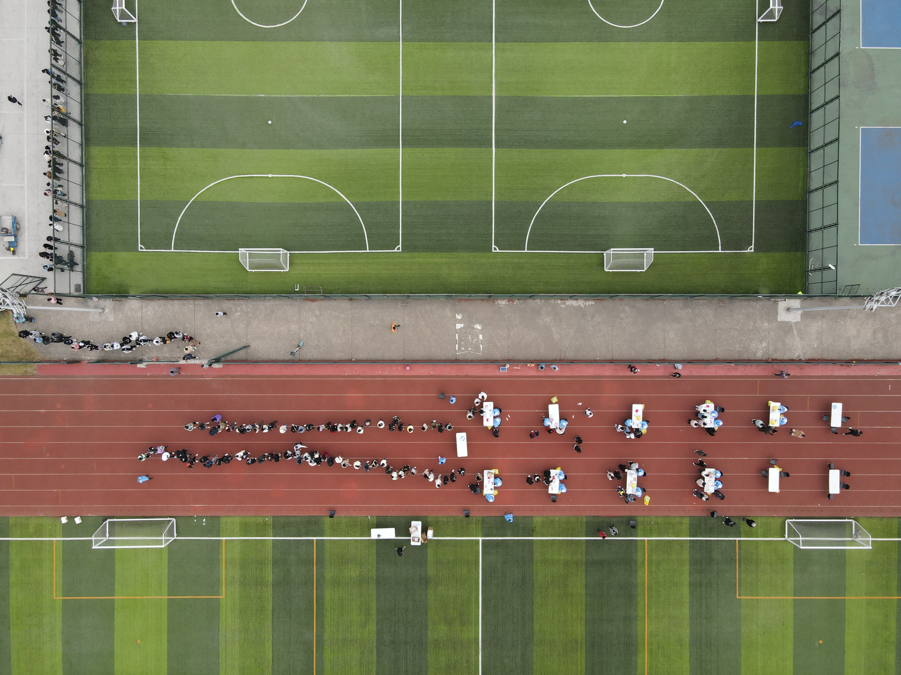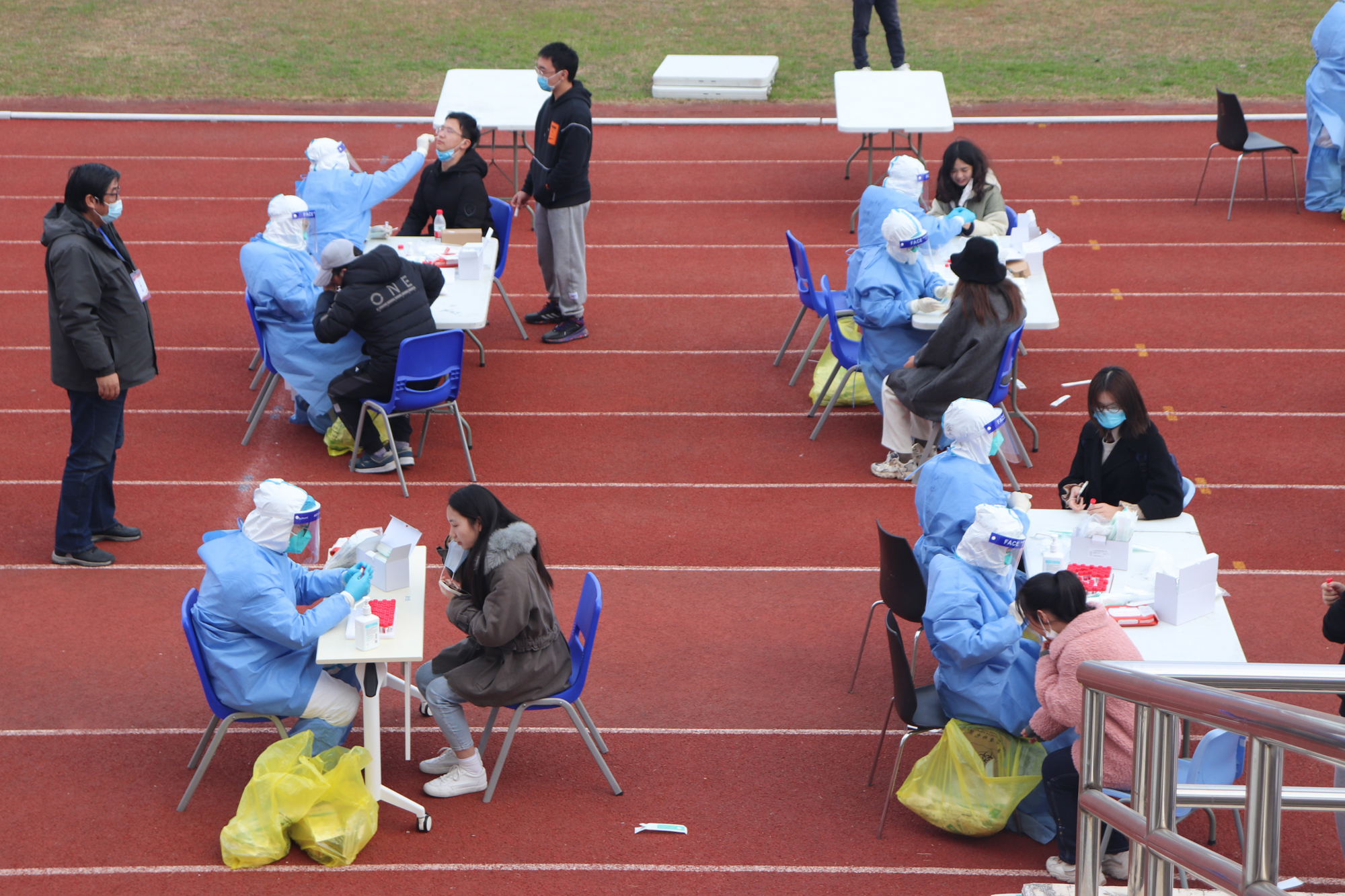 12时,闵行校区操场、宿舍楼等各区域7个核酸检测点设置完成。