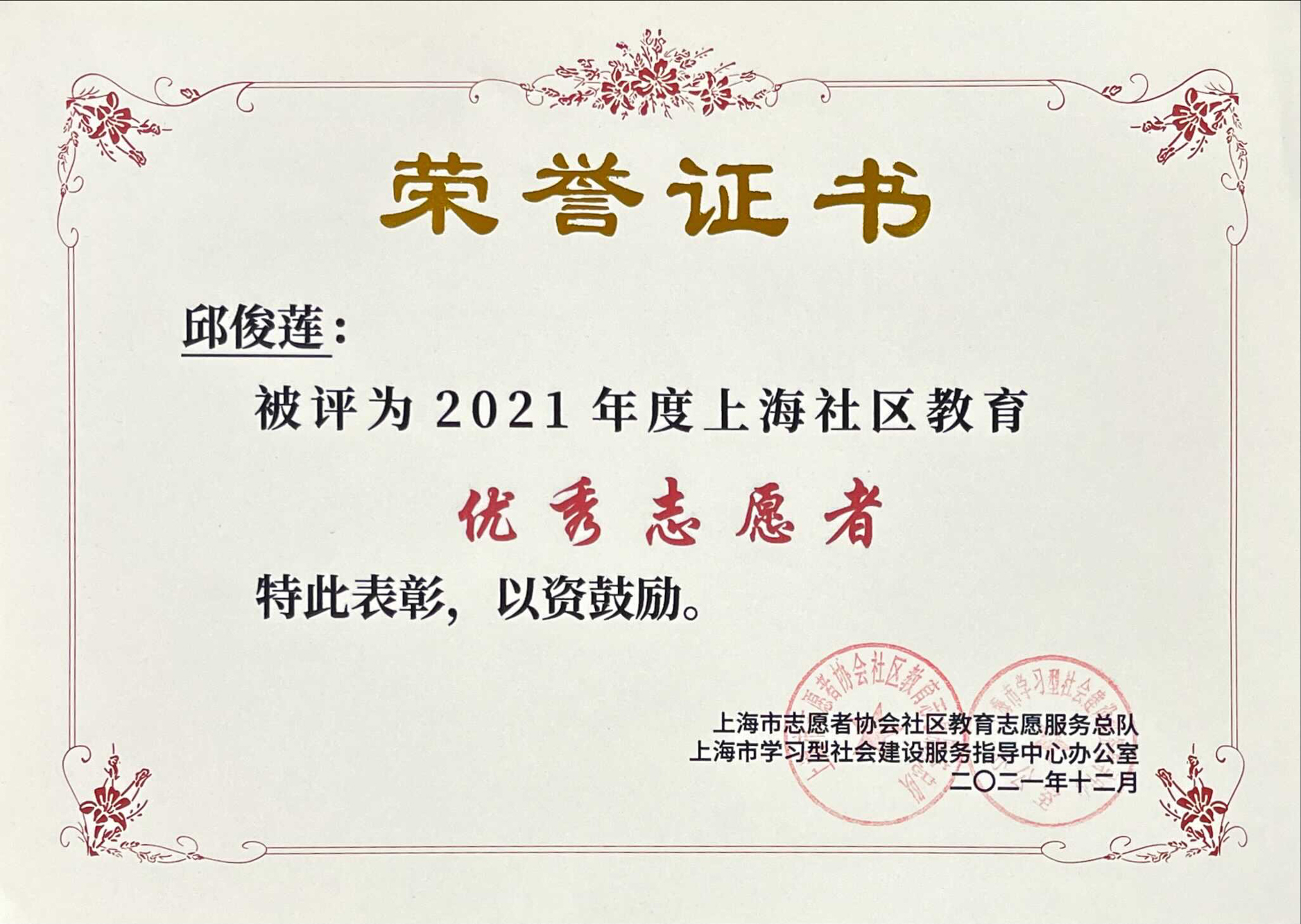 马丽华、邱俊莲老师获“2021年度上海社区教育优秀志愿者”称号