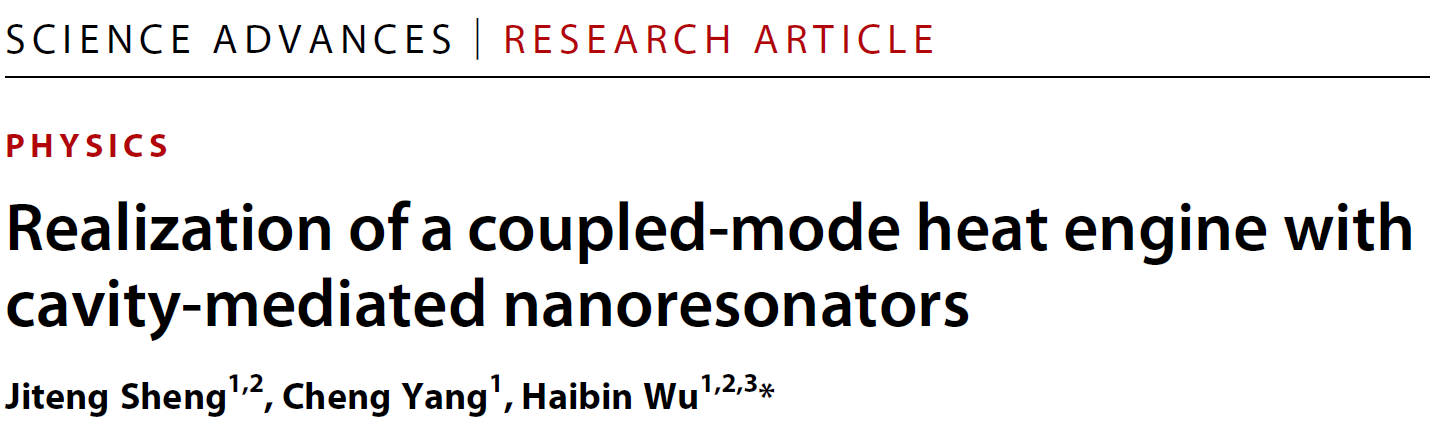 该成果以“Realization of a coupled-mode heat engine with cavity-mediated nanoresonators”为题于12月8日发表在Science Advances 上。澳门永利皇宫官网入口为论文的完成单位。紫江青年盛继腾研究员为该工作第一作者,武海斌教授为论文的通讯作者。