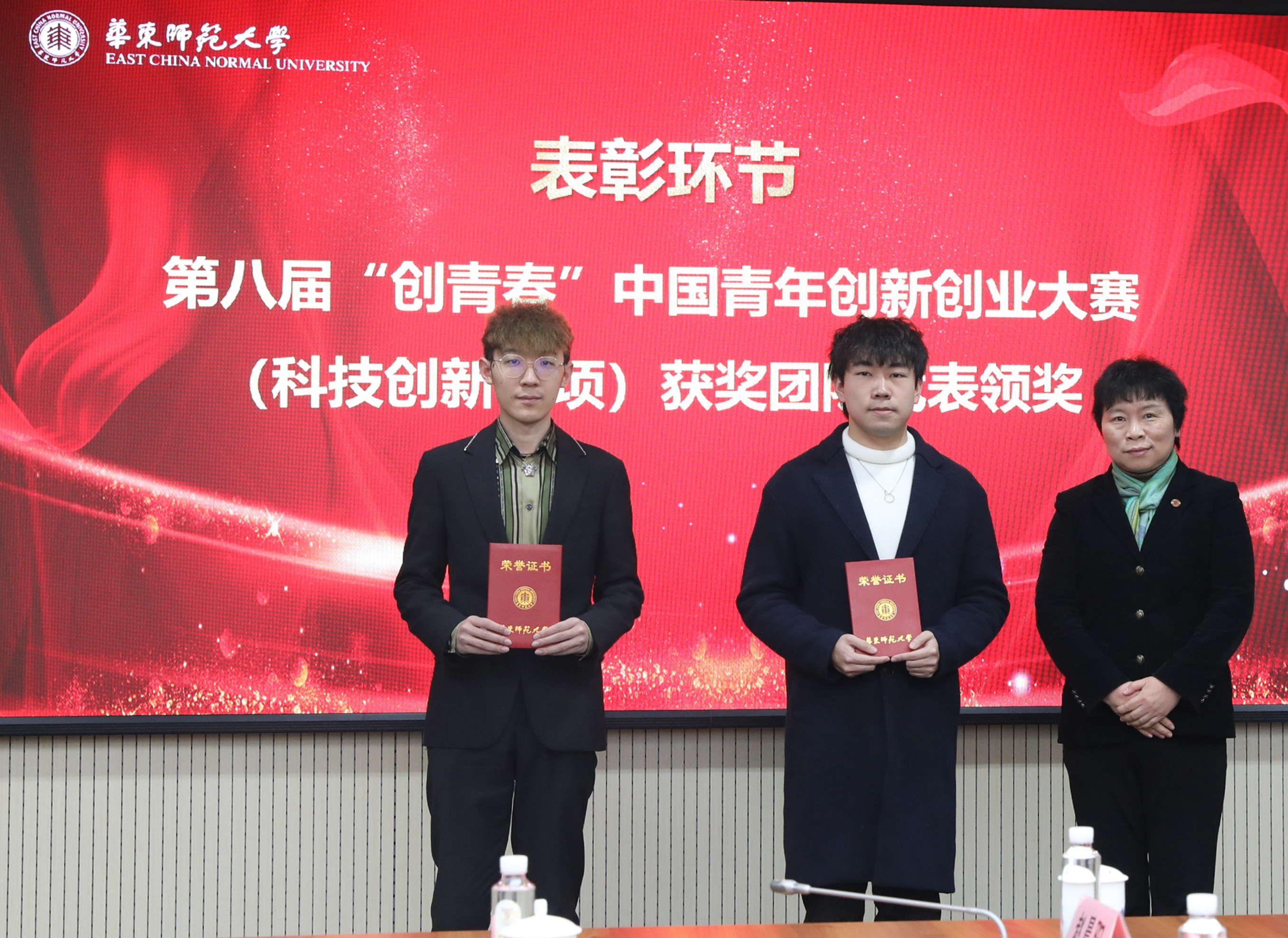“互联网+”大学生创新创业大赛由教育部、共青团中央等单位共同主办,是全国层次最高、影响力最大、参与面最广、含金量最高的双创大赛。在今年的大赛中,我们师大学子继续取得了优异成绩,在全国总决赛中,我校勇夺4金1银3铜,金奖数位列全国高校第九、双一流建设高校第六,取得历史最好成绩。在第八届“创青春”中国青年创新创业大赛(科技创新专项)中,我校同学斩获一金一银,保持连续三年在此项赛事摘金,金奖总数位列上海第一。会上,党委副书记杨昌利,副校长戴立益分别为获奖团队代表颁奖。创新创业学院常务副院长阮平章宣读表彰决定。