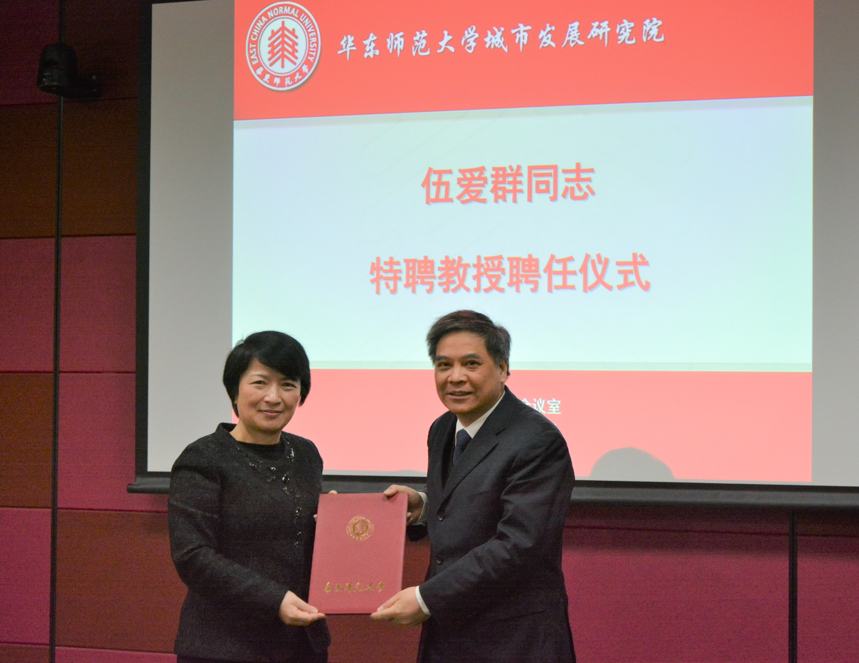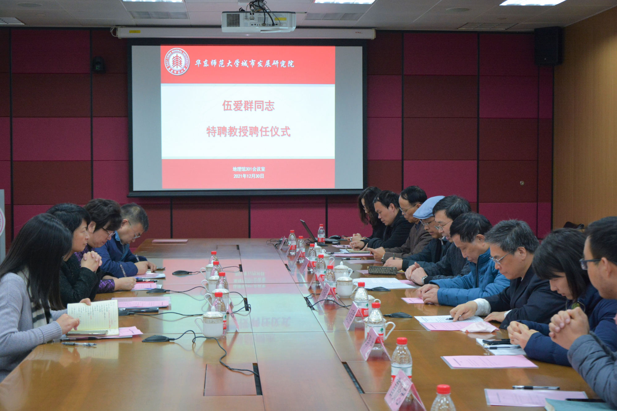 2021年12月30日上午,上海市政协委员、上海市政协经济委员会副主任、上海航天信息科技研究院院长伍爱群受聘澳门永利皇宫官网入口特聘教授仪式在城市发展研究院举行。华东师大党委书记梅兵为伍爱群颁发聘书。华东师大人文与社会科学研究院副院长费斌,人事处副处长战新华,华东师大原党委副书记、城市发展研究院副理事长罗国振教授,城市发展研究院院长曾刚教授,城市发展研究院文新华教授、谷人旭教授等出席聘任仪式。聘任仪式由华东师大校长助理吴瑞君教授主持。