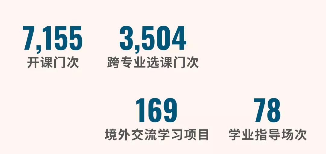 本年度本科生开课7155门次、跨专业选课3504门次、开展线上线下境外交流学习项目169个、开展学业指导活动78场、完成转专业352人、继续实施转师范通道,2021届全日制本科毕业生去向落实率为97.18%(其中45.32%毕业生选择深造)。