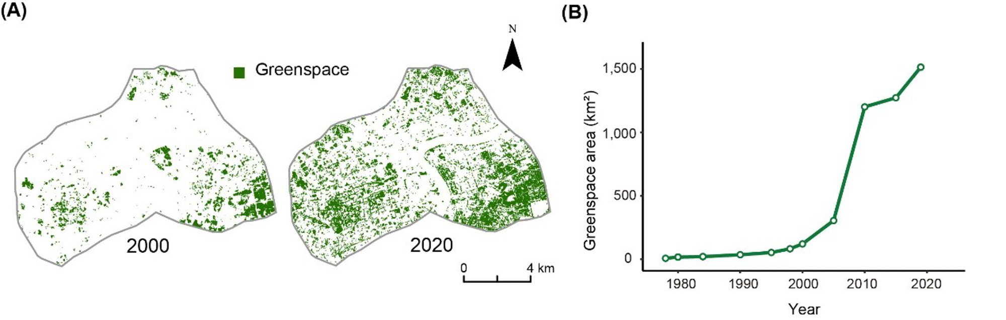 图1:2000和2020年上海内环以内绿色空间的分布