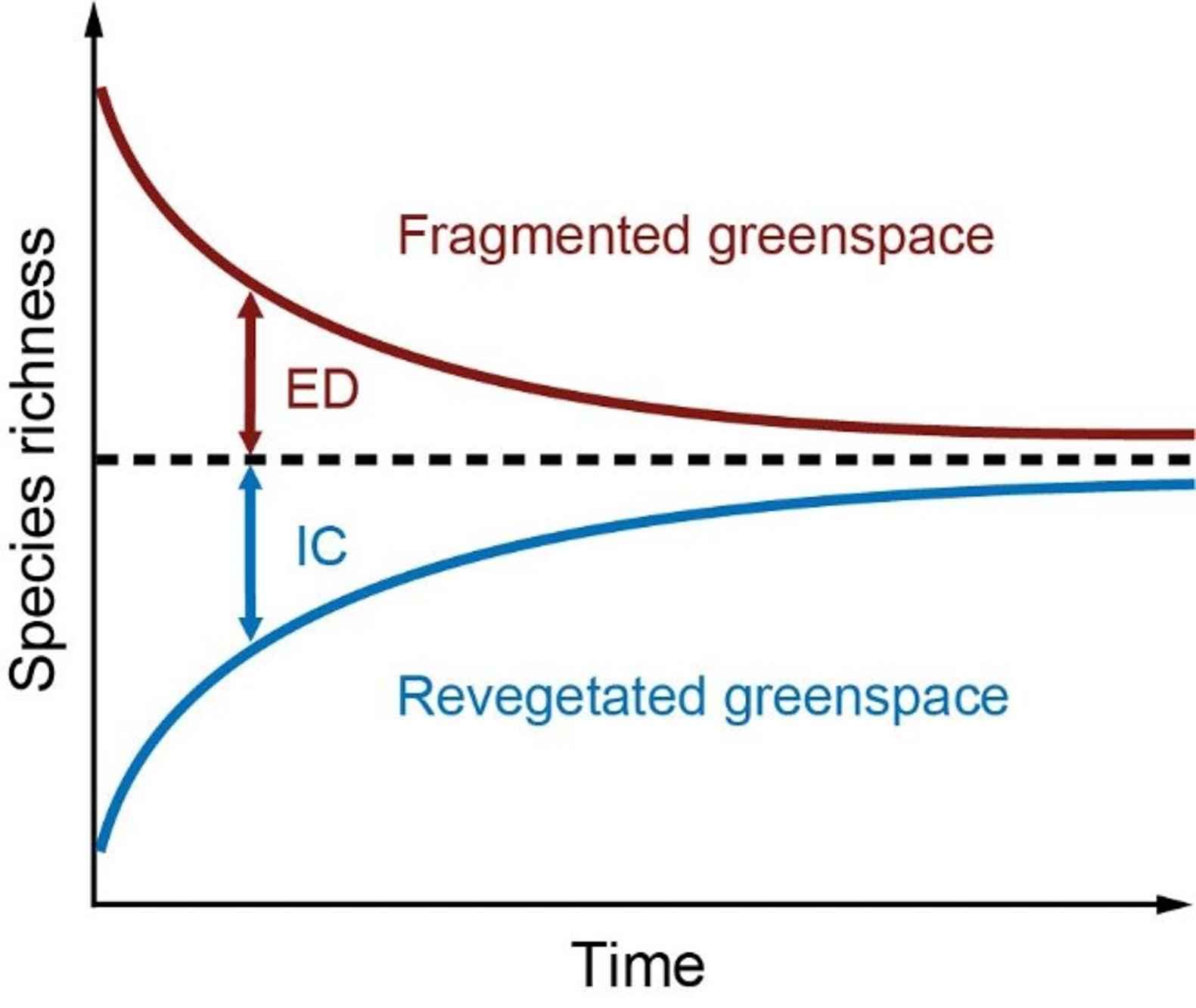 岛屿生物地理学理论指出一个生境上的生物多样性取决于物种迁入和灭绝的动态平衡,当达到平衡时面积越大,物种丰富度就越高。不论在破碎化后的残留生境,还是新建生境,初期生物多样性都未达到平衡。以物种多样性而言,破碎化后残留生境上物种数高于达到平衡时的物种数,因而有些物种将会消失,即存在灭绝债(Extinction Debt, ED),随着时间延伸,将逐渐达到平衡时的物种数。新建生境最初物种数少,甚至为0,随着时间延伸,将有新的物种迁入,最终将达到理论预测的平衡状态时的物种数,也就是在初期存在迁入亏(Immigration Credit, IC) (图2)。