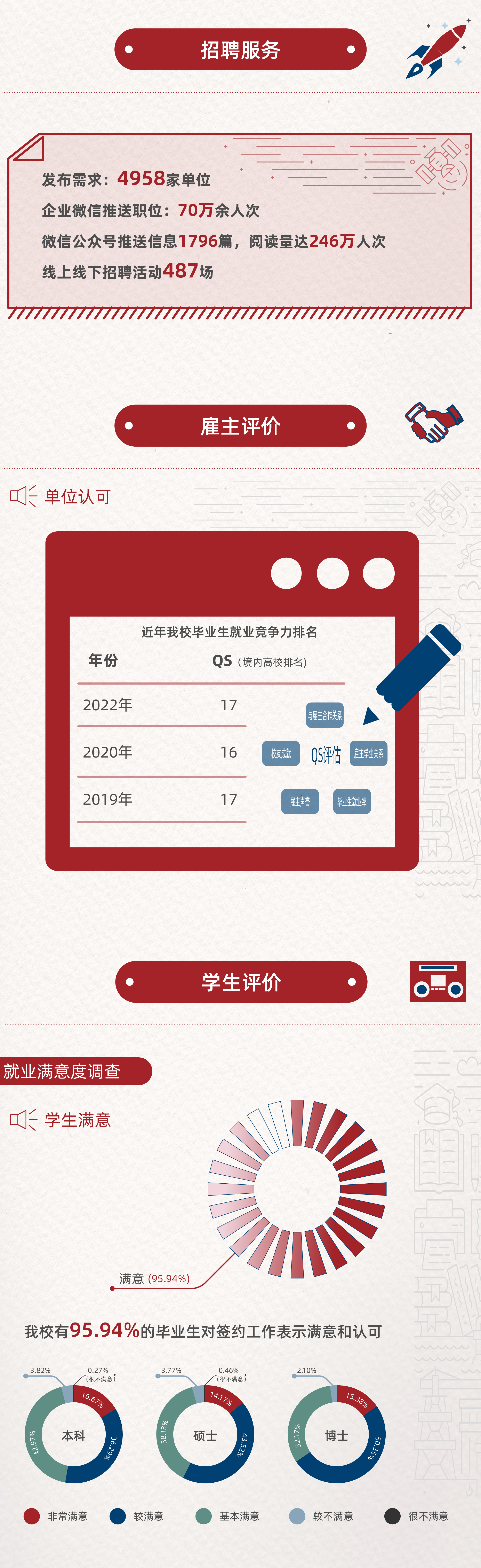 在对学校就业服务工作的满意度方面,过九成的毕业生表示满意和认可。