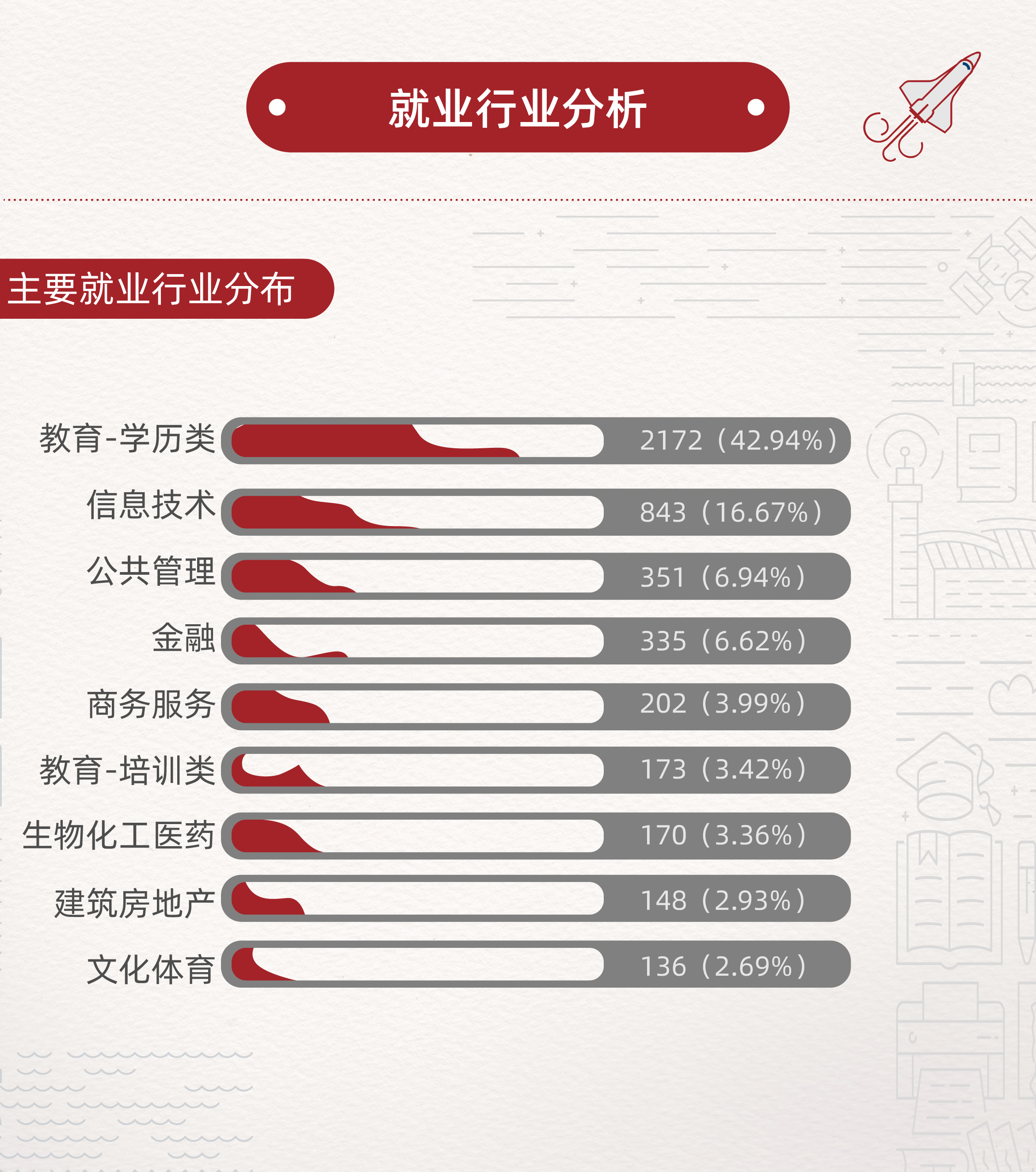 毕业生就业行业分布较为广泛,主要在教育、信息技术、公共管理等十余个行业内。