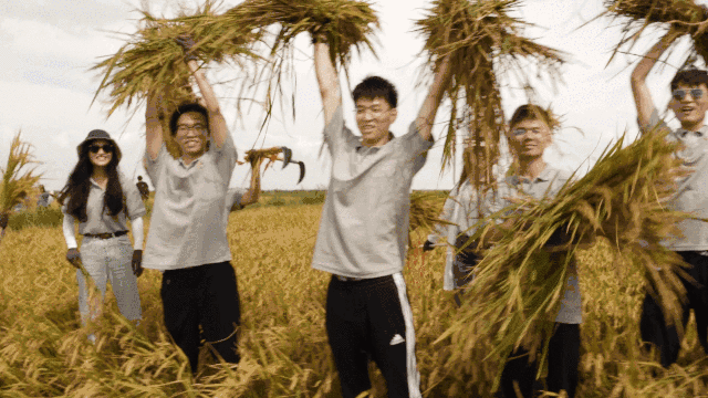 同学们在学校劳动教育实践基地收割“幸福生态米”