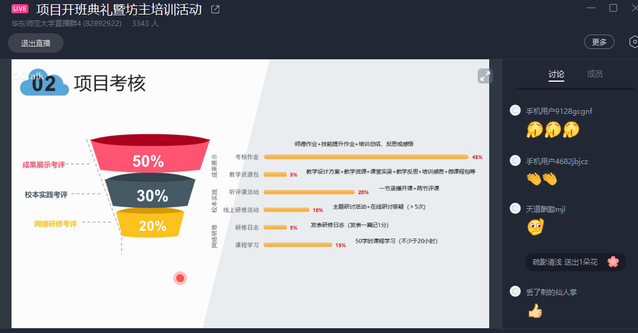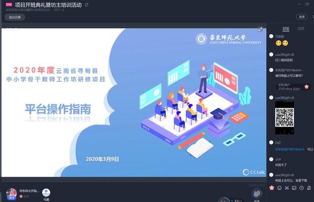 2020年是高质量打赢脱贫攻坚战的决战决胜之年。面对突如其来的新冠疫情,华东师大第一时间学习贯彻习近平总书记在决战决胜脱贫攻坚座谈会上的讲话精神,在教育战场“两线作战”,统筹推进新冠肺炎疫情防控和定点帮扶云南省寻甸县相关工作,吹响了向绝对贫困发起最后总攻的“冲锋号”。为了最大限度地降低疫情对寻甸县孩子们学业造成的不利影响,保障基础教育“停课不停学”高质量落实,华东师大整合教师教育、教育研究优势资源,为寻甸县量身定制 “2020年度云南省寻甸县中小学骨干教师工作坊研修项目”。抢时间、加速度,不让疫情阻挡脱贫攻坚的脚步,3月9日华东师大正式“线上开学”当天,该研修项目伴着新学期第一个工作日正式启动。上午9点,46名寻甸县中小学语数英学科坊主、2482名坊员已全部登录华东师大教师研修平台,在特殊时期以“直播进修”的方式开启研修之旅。在今后为期近9个月的系统化培训,学员们将在华东师大专家团队的指导下,开展课程学习、直播活动、听评课活动、专家下校指导、成果展示等网络研修与校本实践相结合的培训活动。