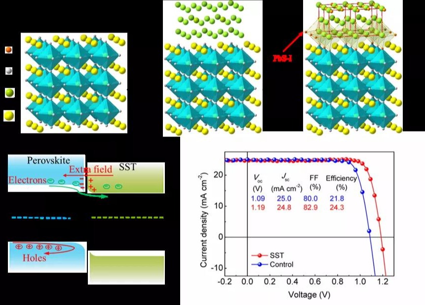图1.表面硫化(SST)以及能带弯曲示意图,钙钛矿电池的J-V曲线