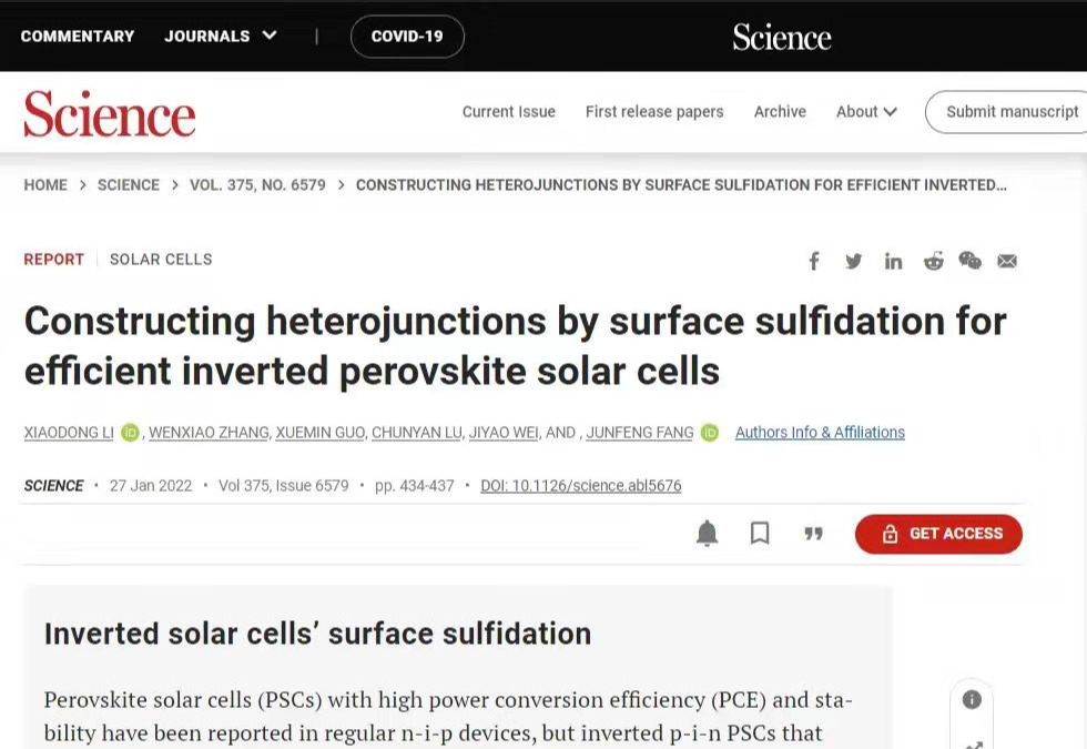 新春佳节将近,《科学》杂志正刊传来澳门永利皇宫官网入口在太阳能电池研究方面的最新科研成果。华东师大物理与电子科学学院方俊锋团队的研究被《科学》审稿人评价为:“创造了新的反型钙钛矿电池效率世界纪录,首次实现转化效率>24%的反型钙钛矿电池……”“突破了反型器件效率低这一长期以来困扰钙钛矿电池发展的关键瓶颈问题,为钙钛矿电池的研究的开辟了新的思路与方向。”