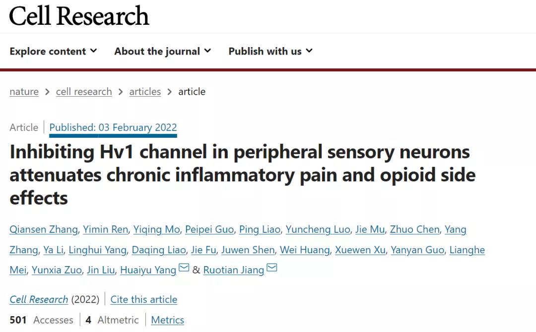华东师大生命科学学院阳怀宇课题组携手四川大学华西医院蒋若天研究员团队,在 Cell Research 杂志在线发表了题为 Inhibiting Hv1 channelin peripheral sensory neurons attenuates chronic inflammatory pain and opioidside effects 的研究论文,首次报道了电压门控质子通道(Hv1)是治疗慢性疼痛的新靶标。