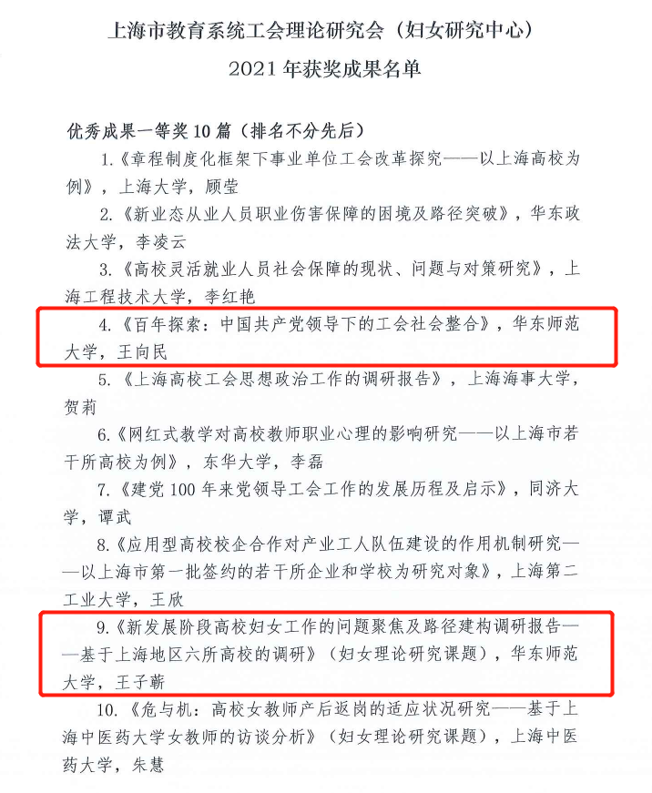 近日,根据上海市教育工会发布的《关于公布上海市教育系统工会理论研究会(妇女研究中心)2021年立项课题结果的通知》,华东师大政治学系王向民教授领衔的《百年探索:中共领导下的工会社会整合》、政治学系王子蕲副教授领衔的《新发展阶段高校妇女工作的问题聚焦及路径建构调研报告——基于上海地区六所高校的调研》两项委托重点课题分别被评为工会理论研究课题、妇女理论研究课题“优秀成果一等奖”。