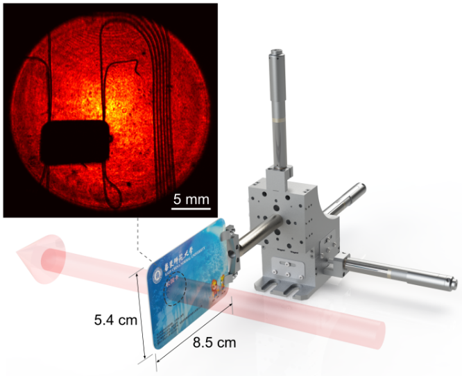 为此,曾和平教授团队提出了基于啁啾准相位匹配的上转换广角成像技术,利用啁啾极化铌酸锂晶体(CPLN)实现了不同角度入射信号的自适应相位匹配,获得的接收角较传统方案提升了至少1个量级。同时,该团队结合同步脉冲泵浦技术与窄带高效滤波技术有效压制背景噪声,获得了1光子/脉冲极低照度下单光子水平的中红外大视场成像。进一步地,研究人员利用该中红外成像系统实现了校园卡内部结构的实时扫描检测,清晰识别了卡片芯片与金属线圈。该成像技术有望应用于半导体芯片检测、材料无损探伤等领域。
